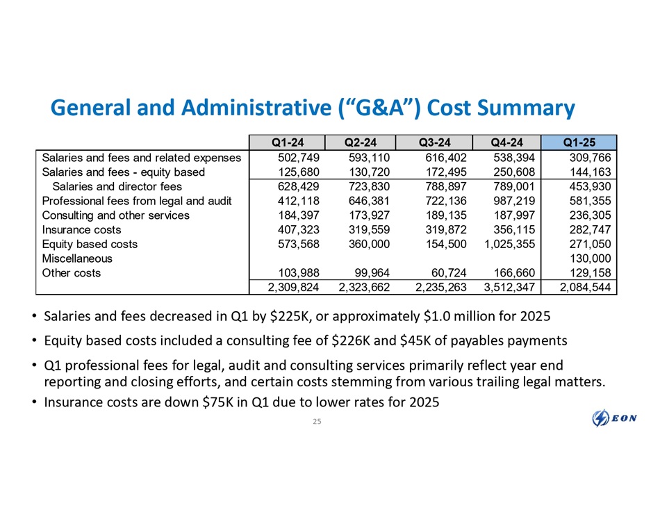 General and Administrative (“G&A”) Cost Summary • Salaries and fees decreased in Q1 by $225K, or approximately $1.0 million for 2025 • Equity based costs included a consulting fee of $226K and $45K of payables payments • Q1 professional fees for legal, audit and consulting services primarily reflect year end reporting and closing efforts, and certain costs stemming from various trailing legal matters. • Insurance costs are down $75K in Q1 due to lower rates for 2025 25 Q1 - 25 Q4 - 24 Q3 - 24 Q2 - 24 Q1 - 24 309,766 538,394 616,402 593,110 502,749 Salaries and fees and related expenses 144,163 250,608 172,495 130,720 125,680 Salaries and fees - equity based 453,930 789,001 788,897 723,830 628,429 Salaries and director fees 581,355 987,219 722,136 646,381 412,118 Professional fees from legal and audit 236,305 187,997 189,135 173,927 184,397 Consulting and other services 282,747 356,115 319,872 319,559 407,323 Insurance costs 271,050 1,025,355 154,500 360,000 573,568 Equity based costs 130,000 Miscellaneous 129,158 166,660 60,724 99,964 103,988 Other costs 2,084,544 3,512,347 2,235,263 2,323,662 2,309,824