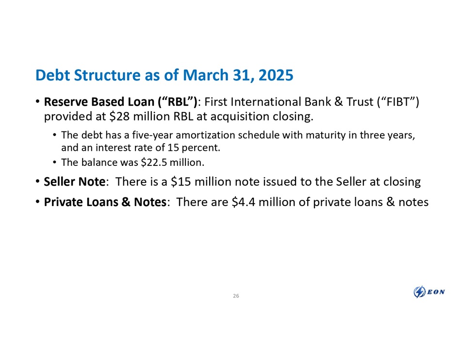 Debt Structure as of March 31, 2025 • Reserve Based Loan (“RBL”) : First International Bank & Trust (“FIBT”) provided at $28 million RBL at acquisition closing. • The debt has a five - year amortization schedule with maturity in three years, and an interest rate of 15 percent. • The balance was $22.5 million. • Seller Note : There is a $15 million note issued to the Seller at closing • Private Loans & Notes : There are $4.4 million of private loans & notes 26