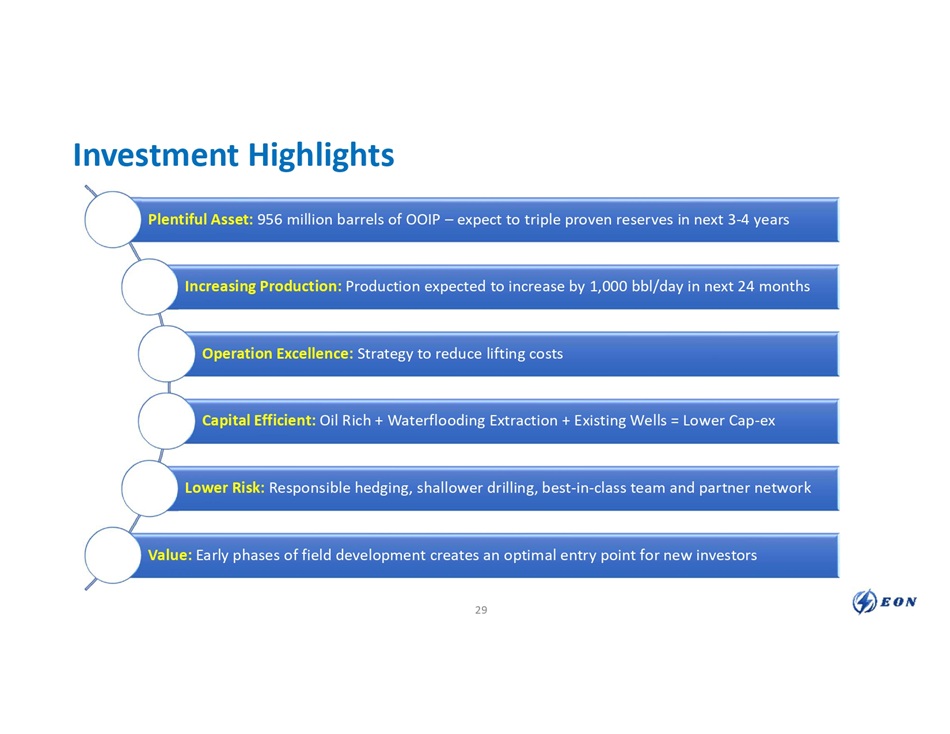 Investment Highlights Plentiful Asset: 956 million barrels of OOIP – expect to triple proven reserves in next 3 - 4 years Increasing Production: Production expected to increase by 1,000 bbl/day in next 24 months Operation Excellence: Strategy to reduce lifting costs Capital Efficient: Oil Rich + Waterflooding Extraction + Existing Wells = Lower Cap - ex Lower Risk: Responsible hedging, shallower drilling, best - in - class team and partner network Value: Early phases of field development creates an optimal entry point for new investors 4