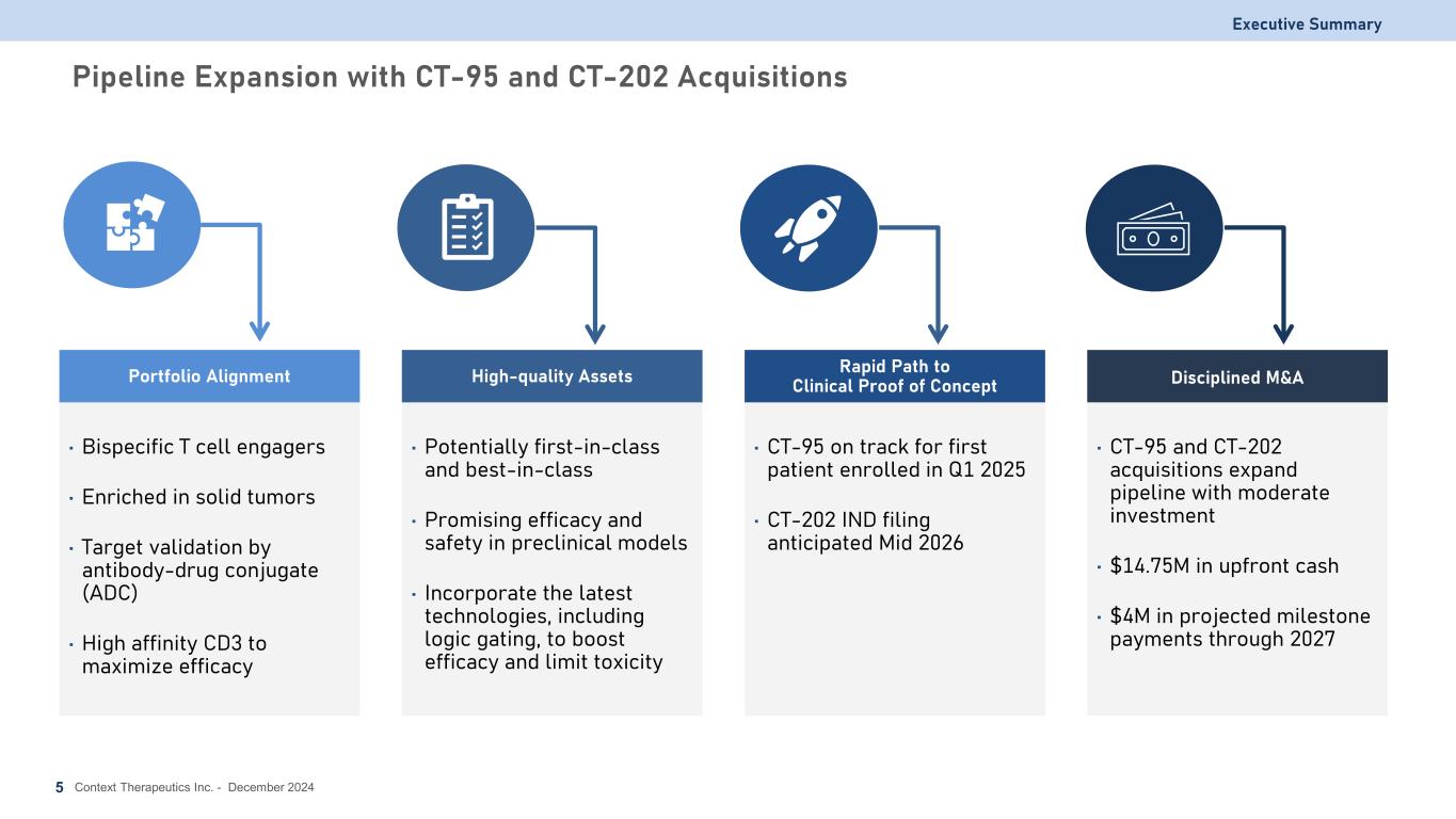 Executive Summary Pipeline Context Therapeutics Inc. - December 20244 PROGRAM TARGET ADDRESSABLE MARKET (U.S. ONLY) DISCOVERY DEVELOPMENT PHASE 1 PHASE 2 RECENT & ANTICIPATED MILESTONES CTIM-76 Claudin 6 (CLDN6) > 50,000 patients First patient dose expected 1Q 2025 Initial data 1H 2026 CT-95 Mesothelin (MSLN) > 100,000 patients First patient dose expected 1Q 2025 Initial data Mid 2026 CT-202 Nectin-4 > 125,000 patients Asset acquisition September 2024 IND filing Mid 2026 CTIM-76: CLDN6 x CD3 CT-95: MSLN x CD3 Product differentiation: highly selective for CLDN6 over CLDN3/4/9 Safety: potent CD3 induction without broad cytokine activation Cancer Indications: ovarian, endometrial, lung, testicular α-CLDN6 Fab α-CD3 scFv α-MSLN Fab α-CD3 scFv CT-202: Nectin-4 x CD3 Product differentiation: avidity optimized to avoid mesothelin (MSLN) fragments Safety: sterically hindered CD3 to avoid T cell crosslinking Cancer indications: lung, pancreatic, ovarian, mesothelioma α-Nectin-4 Fab α-CD3 scFv Product differentiation: conditionally activate in the tumor microenvironment Safety: sterically hindered CD3 to avoid T cell crosslinking Cancer indications: bladder, colon, breast