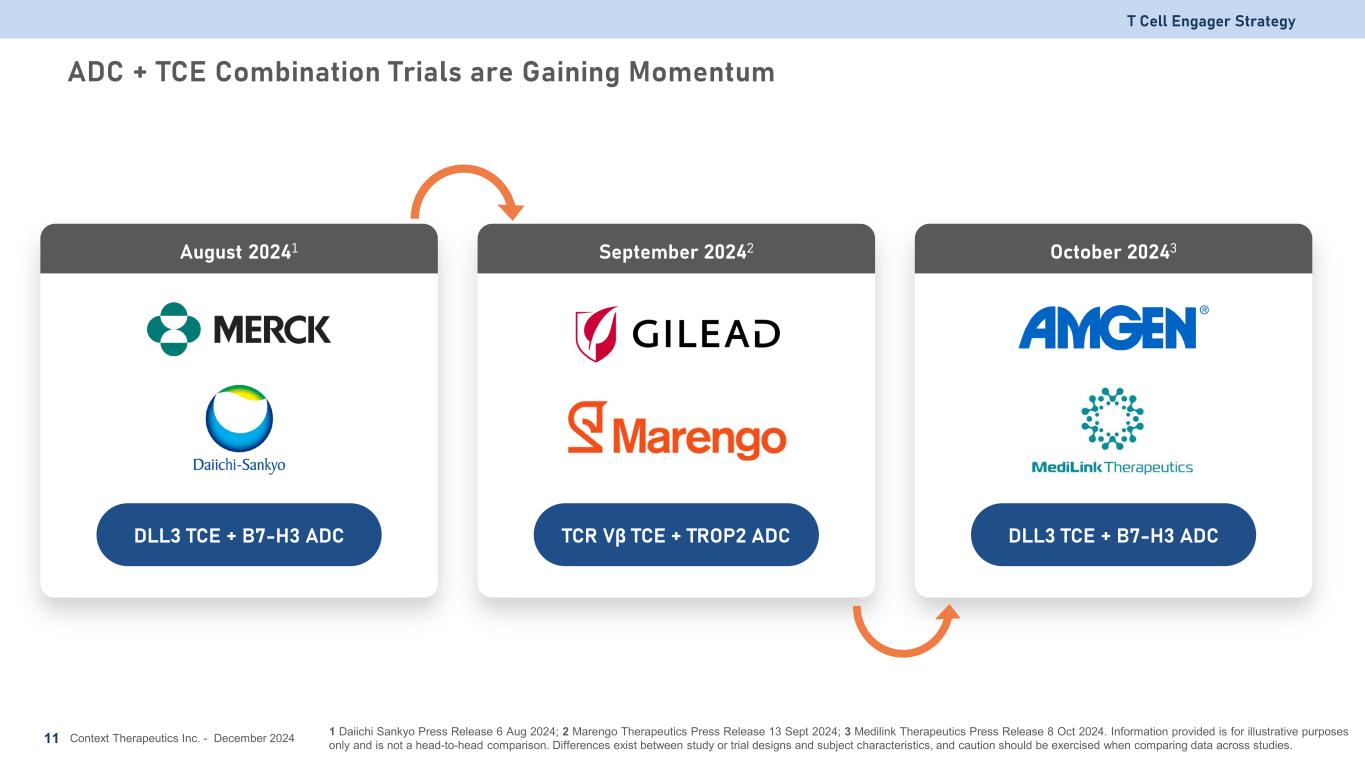 T Cell Engager Strategy ADC + TCE Combination Trials are Gaining Momentum Context Therapeutics Inc. - December 202411 August 20241 September 20242 October 20243 DLL3 TCE + B7-H3 ADC TCR Vβ TCE + TROP2 ADC DLL3 TCE + B7-H3 ADC 1 Daiichi Sankyo Press Release 6 Aug 2024; 2 Marengo Therapeutics Press Release 13 Sept 2024; 3 Medilink Therapeutics Press Release 8 Oct 2024. Information provided is for illustrative purposes only and is not a head-to-head comparison. Differences exist between study or trial designs and subject characteristics, and caution should be exercised when comparing data across studies.
