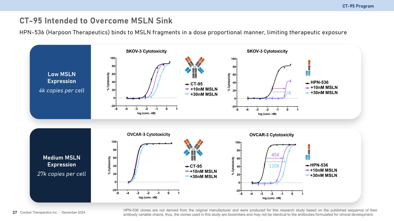 Two-Pronged Approach to Overcoming Soluble MSLN Sink Challenge CT-95 Program 26 Binds MSLN Epitope Close to Cell Surface Activates T cells Through Cooperative Binding + CD3 Potent T cell activationNo T cell activation No crosslinking with shed MSLN MSLN on tumor crosslinks CD3Far From cell surface Close To cell surface Amatuximab MORAb-009 mAb Anetumab BAY 94-9343 ADC CT-95 Binds membrane- proximal epitope T cell Tumor Context Therapeutics Inc. - December 2024