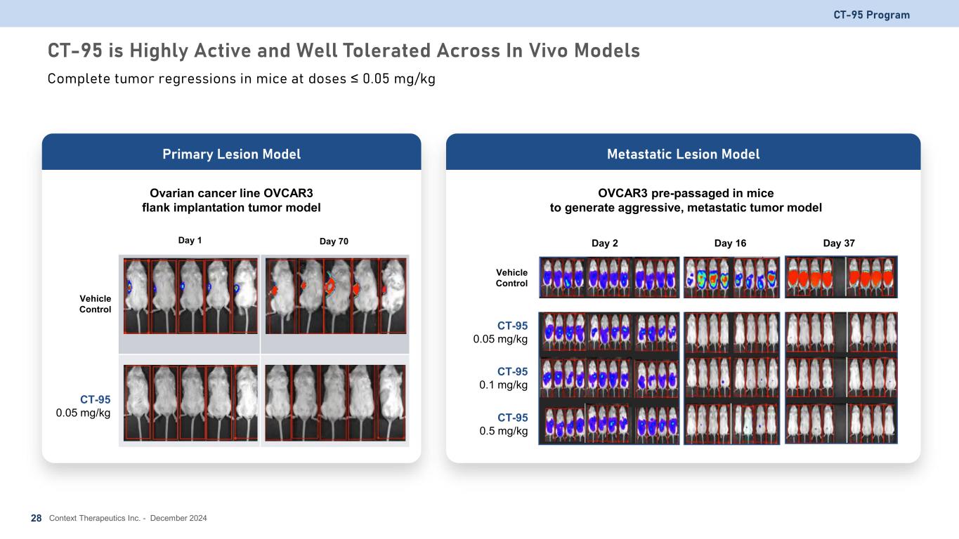 Low MSLN Expression 4k copies per cell Medium MSLN Expression 27k copies per cell CT-95 Intended to Overcome MSLN Sink HPN-536 (Harpoon Therapeutics) binds to MSLN fragments in a dose proportional manner, limiting therapeutic exposure CT-95 Program Context Therapeutics Inc. - December 202427 CT-95 +10nM MSLN +30nM MSLN CT-95 +10nM MSLN +30nM MSLN HPN-536 +10nM MSLN +30nM MSLN HPN-536 +10nM MSLN +30nM MSLN HPN-536 clones are not derived from the original manufacturer and were produced for this research study based on the published sequence of their antibody variable chains; thus, the clones used in this study are biosimilars and may not be identical to the antibodies formulated for clinical development.