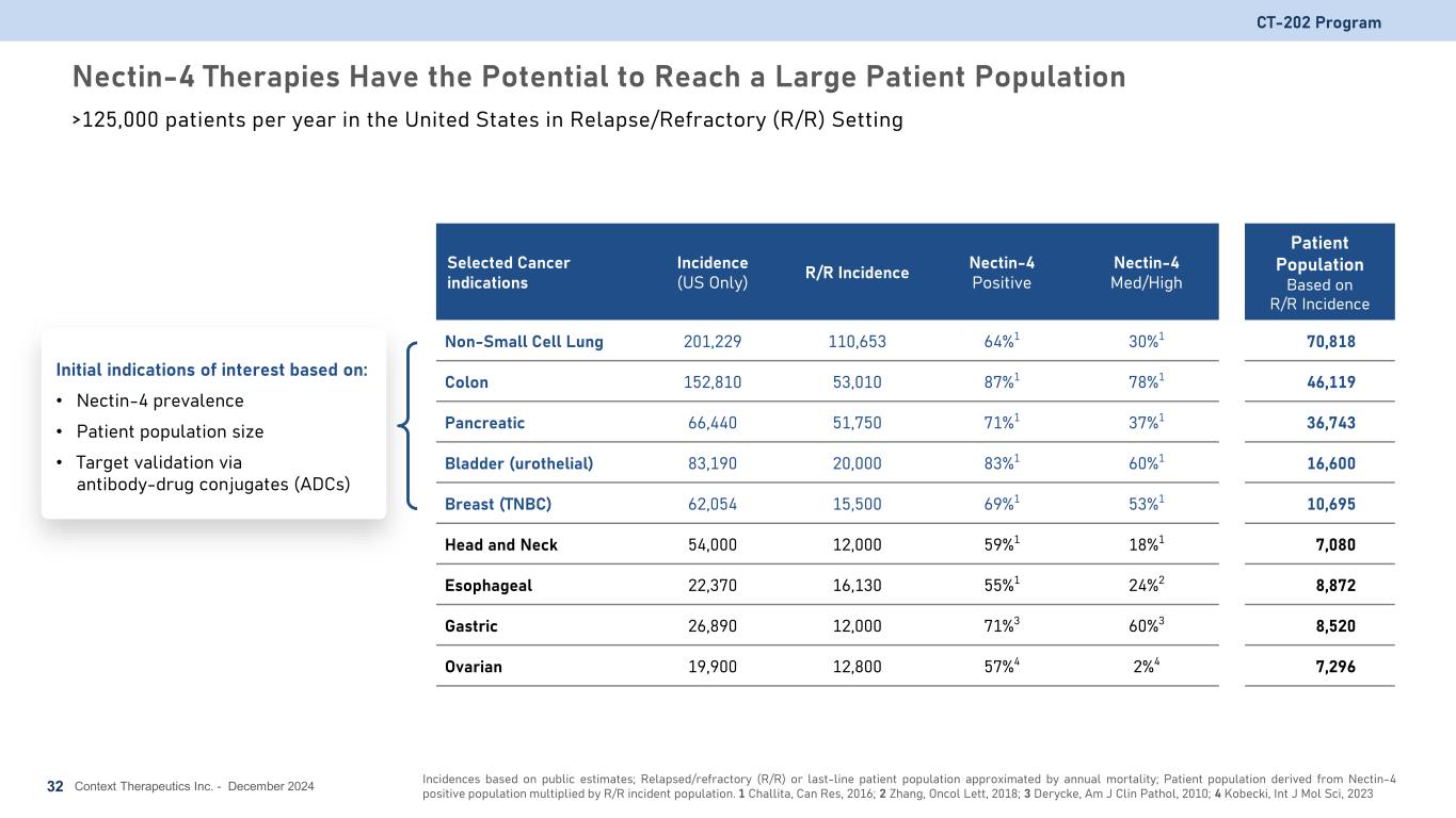 Nectin-4 Therapies Have the Potential to Reach a Large Patient Population >125,000 patients per year in the United States in Relapse/Refractory (R/R) Setting CT-202 Program 32 Context Therapeutics Inc. - December 2024 Selected Cancer indications Incidence (US Only) R/R Incidence Nectin-4 Positive Nectin-4 Med/High Patient Population Based on R/R Incidence Non-Small Cell Lung 201,229 110,653 64%1 30%1 70,818 Colon 152,810 53,010 87%1 78%1 46,119 Pancreatic 66,440 51,750 71%1 37%1 36,743 Bladder (urothelial) 83,190 20,000 83%1 60%1 16,600 Breast (TNBC) 62,054 15,500 69%1 53%1 10,695 Head and Neck 54,000 12,000 59%1 18%1 7,080 Esophageal 22,370 16,130 55%1 24%2 8,872 Gastric 26,890 12,000 71%3 60%3 8,520 Ovarian 19,900 12,800 57%4 2%4 7,296 Initial indications of interest based on: • Nectin-4 prevalence • Patient population size • Target validation via antibody-drug conjugates (ADCs) Incidences based on public estimates; Relapsed/refractory (R/R) or last-line patient population approximated by annual mortality; Patient population derived from Nectin-4 positive population multiplied by R/R incident population. 1 Challita, Can Res, 2016; 2 Zhang, Oncol Lett, 2018; 3 Derycke, Am J Clin Pathol, 2010; 4 Kobecki, Int J Mol Sci, 2023