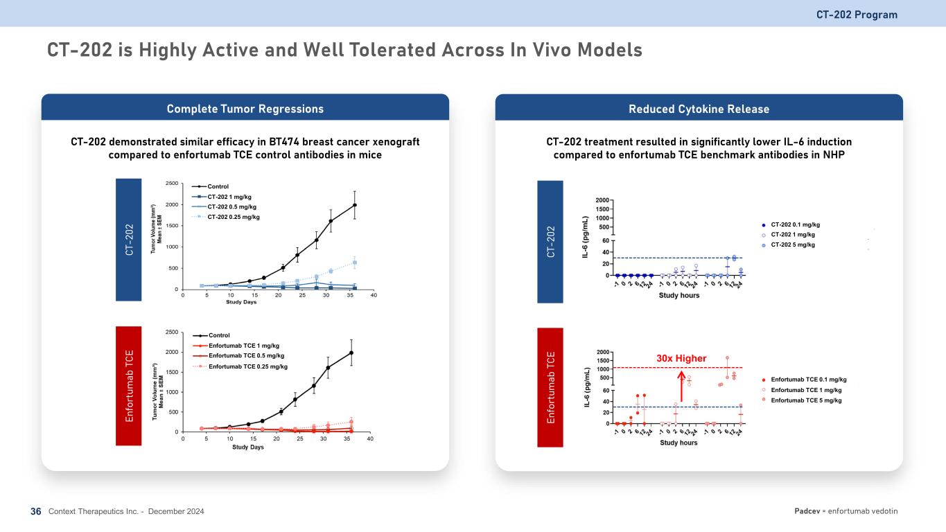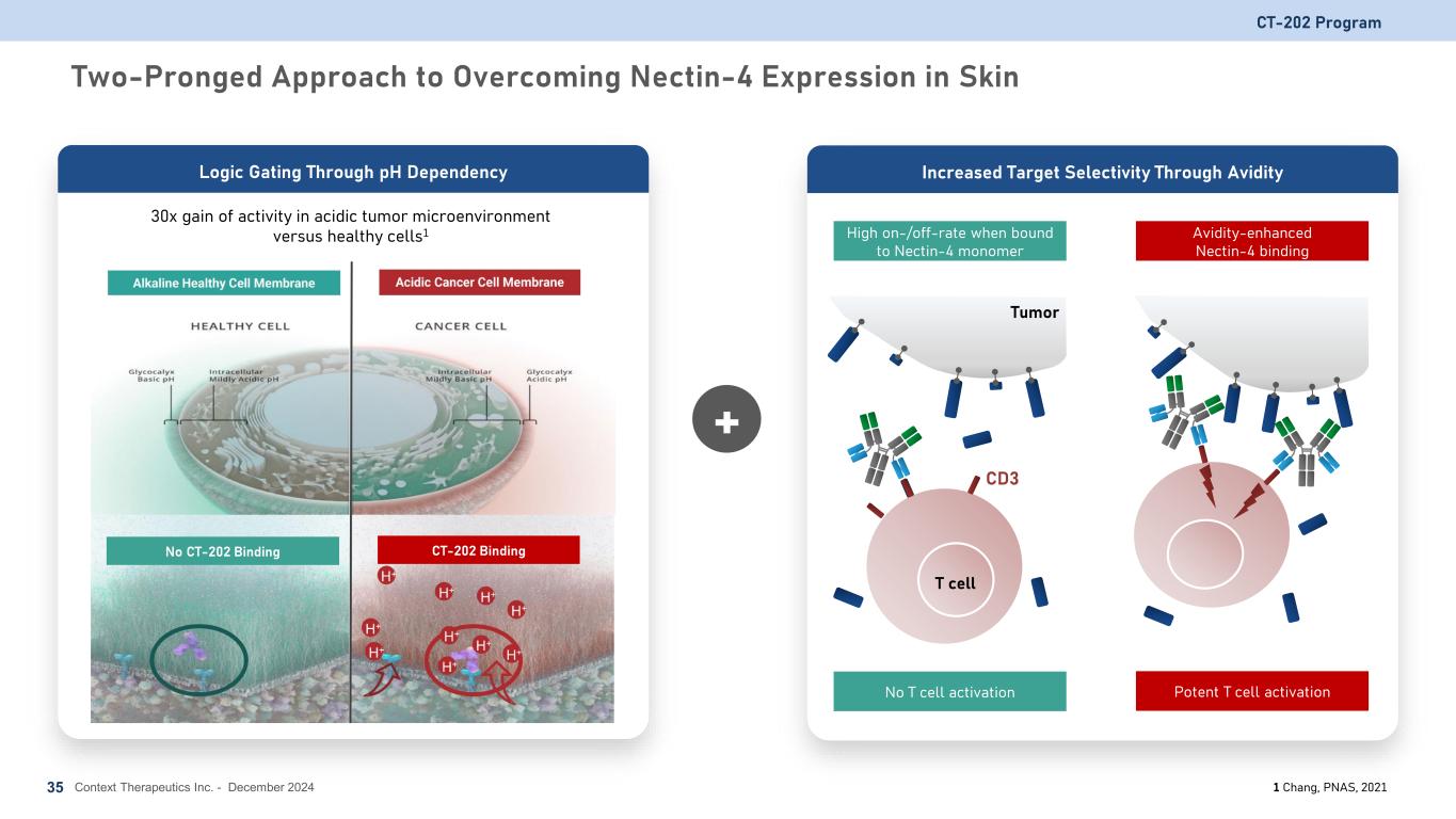 CT-202: Nectin-4 x CD3 T cell Engaging (TCE) Bispecific Antibody CT-202 Program Context Therapeutics Inc. - December 202434 α-Nectin-4 Fab α-CD3 scFv IgG1 backbone Silenced Fc Novel design incorporating logic gating to spare Nectin-4 in normal tissue • Because of its expression in healthy epidermal keratinocytes, sweat glands, and hair follicles, Nectin-4 targeted treatments are associated with dermatological side effects • CT-202 uses pH dependent binding to both Nectin-4 and CD3 to minimize binding to healthy tissues and maximize binding and T cell activation within the tumor microenvironment ̶ ~30x reduction in Nectin-4 binding in healthy tissue vs. cancer tissue ̶ ~6x reduction in T cell activation in healthy tissue vs. cancer tissue Avidity optimized to mitigate CRS risk • Bivalent Nectin-4 binding to reduce T cell crosslinking in the absence of target • Steric hindrance of CD3 binding by Fc domain prevents T cell crosslinking by single CT-202 molecules Ease of manufacturing • IgG1 backbone is highly stable and enables high yield