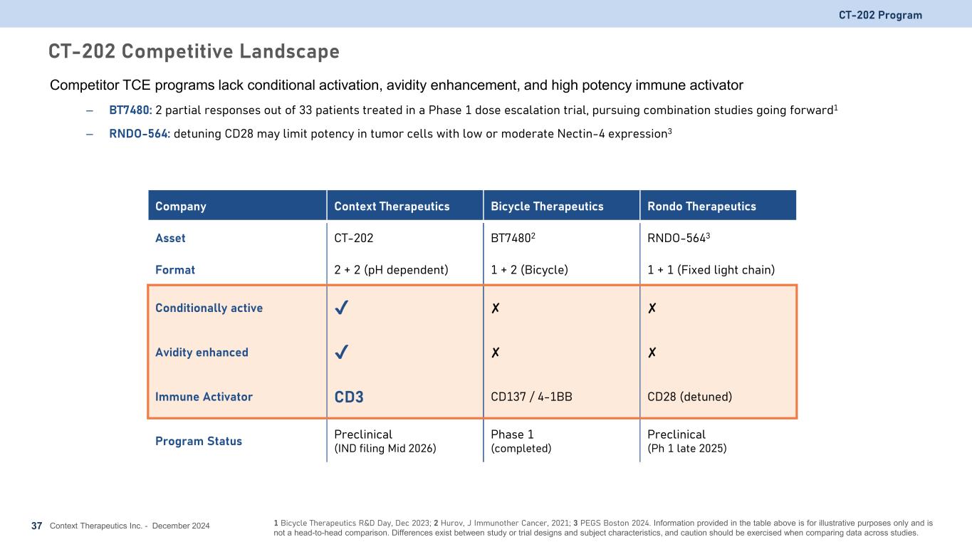 CT-202 Program CT-202 Competitive Landscape Company Context Therapeutics Bicycle Therapeutics Rondo Therapeutics Asset CT-202 BT74802 RNDO-5643 Format 2 + 2 (pH dependent) 1 + 2 (Bicycle) 1 + 1 (Fixed light chain) Conditionally active ✘ ✘ Avidity enhanced ✘ ✘ Immune Activator CD3 CD137 / 4-1BB CD28 (detuned) Program Status Preclinical (IND filing Mid 2026) Phase 1 (completed) Preclinical (Ph 1 late 2025) Competitor TCE programs lack conditional activation, avidity enhancement, and high potency immune activator – BT7480: 2 partial responses out of 33 patients treated in a Phase 1 dose escalation trial, pursuing combination studies going forward1 – RNDO-564: detuning CD28 may limit potency in tumor cells with low or moderate Nectin-4 expression3 1 Bicycle Therapeutics R&D Day, Dec 2023; 2 Hurov, J Immunother Cancer, 2021; 3 PEGS Boston 2024. Information provided in the table above is for illustrative purposes only and is not a head-to-head comparison. Differences exist between study or trial designs and subject characteristics, and caution should be exercised when comparing data across studies. Context Therapeutics Inc. - December 202437