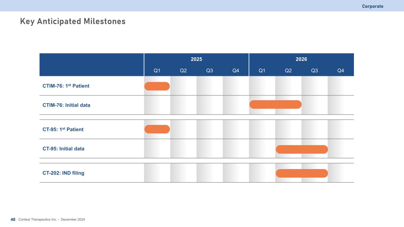 Corporate Experienced Leadership Team • Experienced management team • Clinical team has developed T cell therapies • Our management team is supported by a Board with deep oncology experience, including Harpoon, Mariana Oncology, and Convergent Focus on Execution Martin Lehr CEO and Director Alex Levit, Esq Chief Legal Officer Claudio Dansky Ullmann, MD Chief Medical Officer Karen Andreas, MS VP, Clinical Operations Context Therapeutics Inc. - December 202439 Chris Beck, MBA SVP Operations Jennifer Minai, CPA Chief Financial Officer