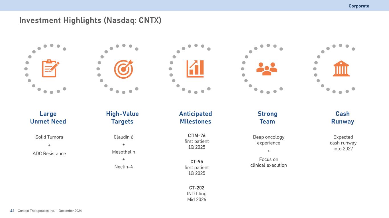 Key Anticipated Milestones 2025 2026 Q1 Q2 Q3 Q4 Q1 Q2 Q3 Q4 CTIM-76: 1st Patient CTIM-76: Initial data CT-95: 1st Patient CT-95: Initial data CT-202: IND filing 40 Context Therapeutics Inc. - December 2024 Corporate