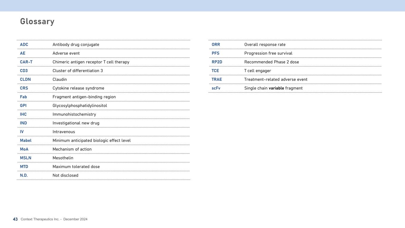Glossary ADC Antibody drug conjugate AE Adverse event CAR-T Chimeric antigen receptor T cell therapy CD3 Cluster of differentiation 3 CLDN Claudin CRS Cytokine release syndrome Fab Fragment antigen-binding region GPI Glycosylphosphatidylinositol IHC Immunohistochemistry IND Investigational new drug IV Intravenous Mabel Minimum anticipated biologic effect level MoA Mechanism of action MSLN Mesothelin MTD Maximum tolerated dose N.D. Not disclosed Context Therapeutics Inc. - December 202443 ORR Overall response rate PFS Progression free survival RP2D Recommended Phase 2 dose TCE T cell engager TRAE Treatment-related adverse event scFv Single chain variable fragment
