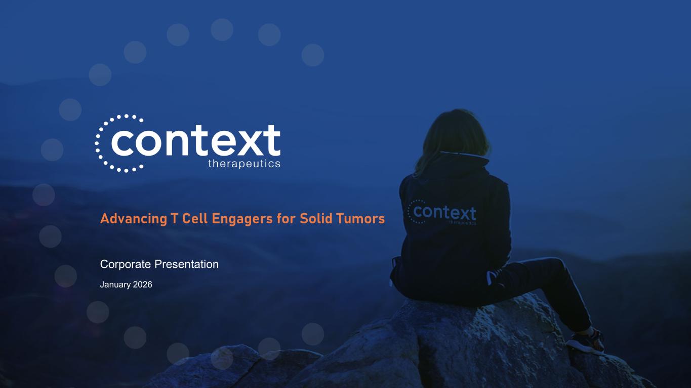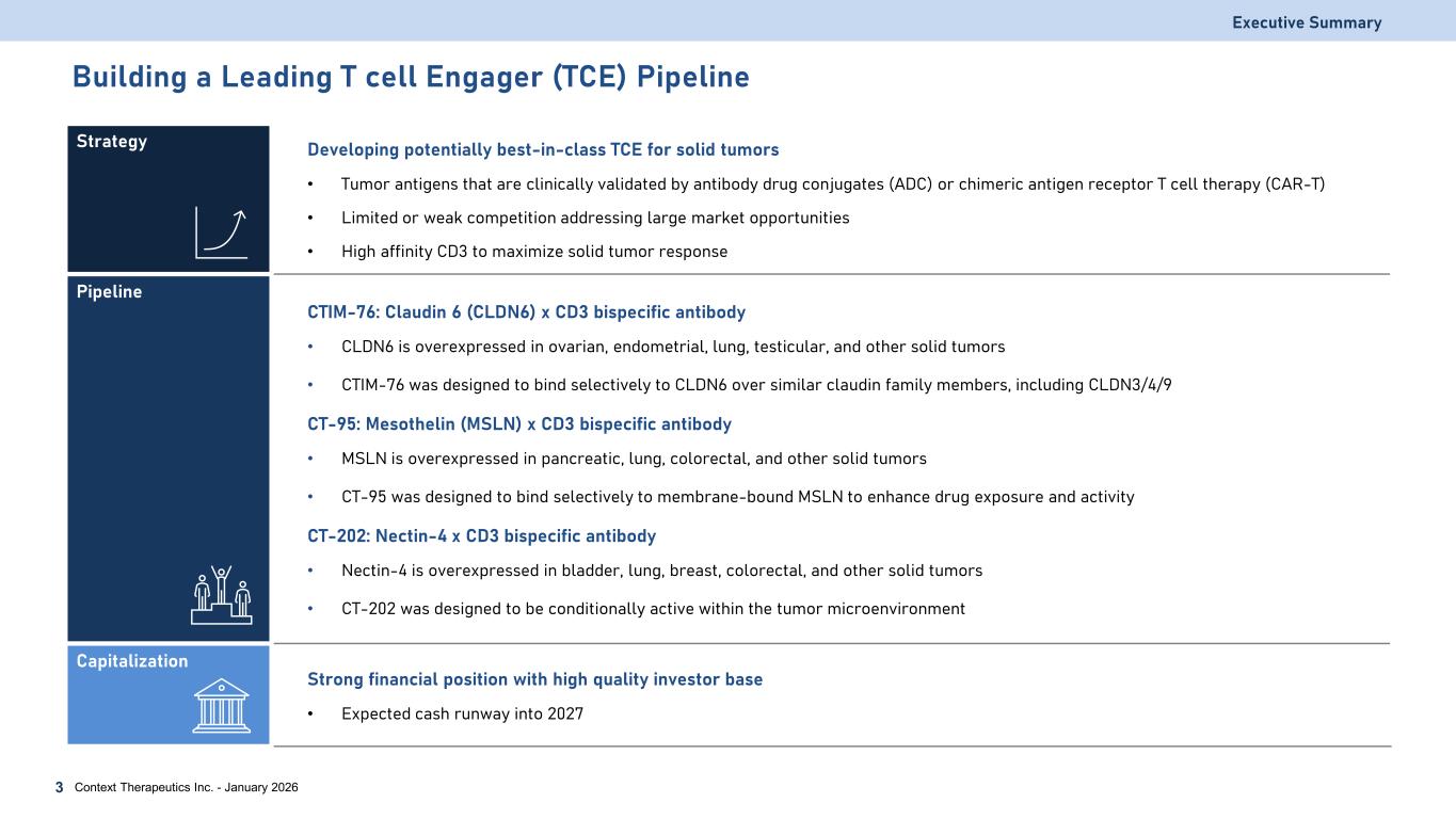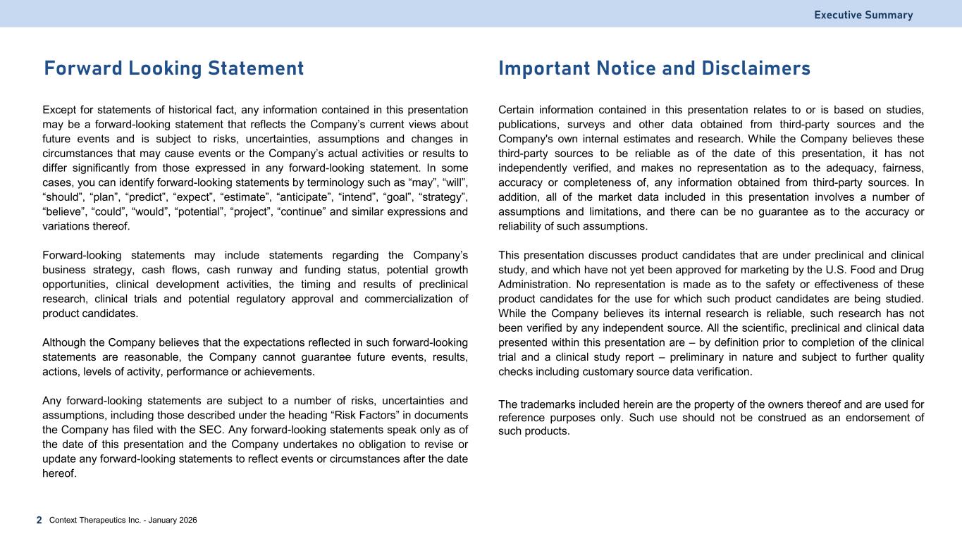 Important Notice and Disclaimers Except for statements of historical fact, any information contained in this presentation may be a forward-looking statement that reflects the Company’s current views about future events and is subject to risks, uncertainties, assumptions and changes in circumstances that may cause events or the Company’s actual activities or results to differ significantly from those expressed in any forward-looking statement. In some cases, you can identify forward-looking statements by terminology such as “may”, “will”, “should”, “plan”, “predict”, “expect”, “estimate”, “anticipate”, “intend”, “goal”, “strategy”, “believe”, “could”, “would”, “potential”, “project”, “continue” and similar expressions and variations thereof. Forward-looking statements may include statements regarding the Company’s business strategy, cash flows, cash runway and funding status, potential growth opportunities, clinical development activities, the timing and results of preclinical research, clinical trials and potential regulatory approval and commercialization of product candidates. Although the Company believes that the expectations reflected in such forward-looking statements are reasonable, the Company cannot guarantee future events, results, actions, levels of activity, performance or achievements. Any forward-looking statements are subject to a number of risks, uncertainties and assumptions, including those described under the heading “Risk Factors” in documents the Company has filed with the SEC. Any forward-looking statements speak only as of the date of this presentation and the Company undertakes no obligation to revise or update any forward-looking statements to reflect events or circumstances after the date hereof. Certain information contained in this presentation relates to or is based on studies, publications, surveys and other data obtained from third-party sources and the Company's own internal estimates and research. While the Company believes these third-party sources to be reliable as of the date of this presentation, it has not independently verified, and makes no representation as to the adequacy, fairness, accuracy or completeness of, any information obtained from third-party sources. In addition, all of the market data included in this presentation involves a number of assumptions and limitations, and there can be no guarantee as to the accuracy or reliability of such assumptions. This presentation discusses product candidates that are under preclinical and clinical study, and which have not yet been approved for marketing by the U.S. Food and Drug Administration. No representation is made as to the safety or effectiveness of these product candidates for the use for which such product candidates are being studied. While the Company believes its internal research is reliable, such research has not been verified by any independent source. All the scientific, preclinical and clinical data presented within this presentation are – by definition prior to completion of the clinical trial and a clinical study report – preliminary in nature and subject to further quality checks including customary source data verification. The trademarks included herein are the property of the owners thereof and are used for reference purposes only. Such use should not be construed as an endorsement of such products. Forward Looking Statement Executive Summary Context Therapeutics Inc. - January 20262