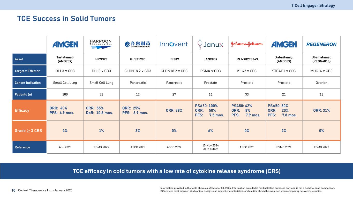 10 FDA Approvals for TCE for Solid and Liquid Tumors Recently approved TCE have had strong initial commercial launches T Cell Engager Strategy Context Therapeutics Inc. - January 20269 2024202320222014 2025 Product Target 2024 Revenue1 Blincyto CD19 x CD3 $1,220 million Tecvayli BCMA x CD3 $549 million Kimmtrak Gp100 x CD3 $310 million Epkinly CD20 x CD3 $281 million Talvey GPRC5D x CD3 $256 million Elrexfio BCMA x CD3 $133 million Columvi CD20 x CD3 $127 million Lunsumio CD20 x CD3 $77 million 1 Information from 2024 10-K filings and other public disclosures. Information provided is for illustrative purposes only and is not indicative of future performance.