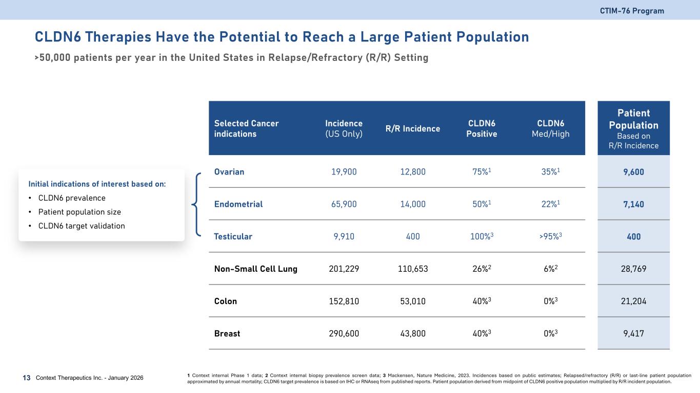 CLDN6 Therapies Have the Potential to Reach a Large Patient Population >50,000 patients per year in the United States in Relapse/Refractory (R/R) Setting CTIM-76 Program 13 Context Therapeutics Inc. - January 2026 Initial indications of interest based on: • CLDN6 prevalence • Patient population size • CLDN6 target validation Selected Cancer indications Incidence (US Only) R/R Incidence CLDN6 Positive CLDN6 Med/High Patient Population Based on R/R Incidence Ovarian 19,900 12,800 75%1 35%1 9,600 Endometrial 65,900 14,000 50%1 22%1 7,140 Testicular 9,910 400 100%3 >95%3 400 Non-Small Cell Lung 201,229 110,653 26%2 6%2 28,769 Colon 152,810 53,010 40%3 0%3 21,204 Breast 290,600 43,800 40%3 0%3 9,417 1 Context internal Phase 1 data; 2 Context internal biopsy prevalence screen data; 3 Mackensen, Nature Medicine, 2023. Incidences based on public estimates; Relapsed/refractory (R/R) or last-line patient population approximated by annual mortality; CLDN6 target prevalence is based on IHC or RNAseq from published reports. Patient population derived from midpoint of CLDN6 positive population multiplied by R/R incident population.