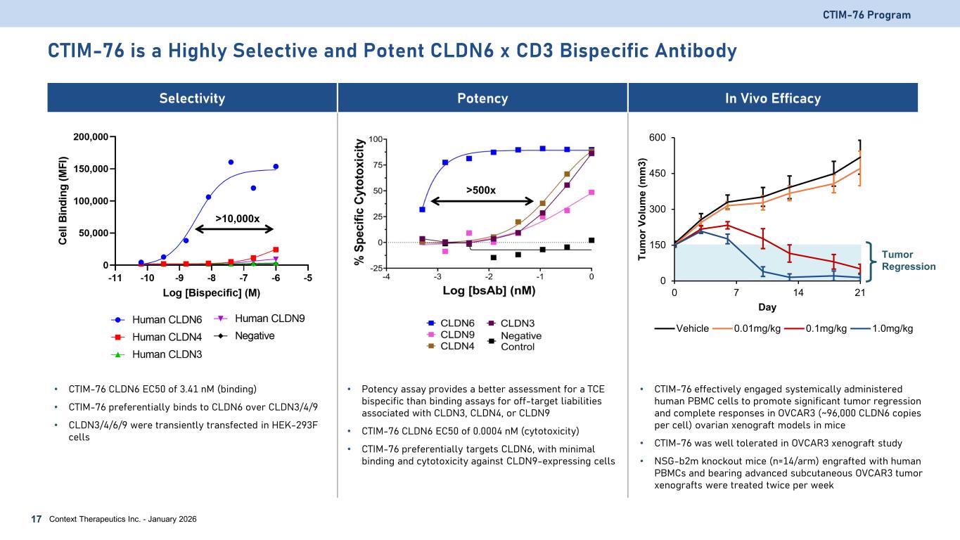 CTIM-76: Claudin 6 x CD3 T cell Engaging (TCE) Bispecific Antibody Optimized structure for CLDN6 selectivity, potency, and manufacturability • Highly selective CLDN6 binding fragment antibody-binding (Fab) arm • Immunostimulatory CD3 binding single-chain fragment variable (scFv) domain is functionally monovalent to avoid aberrant T cell activation • Silenced Fc domain to avoid off target immune cell activation Potentially wide therapeutic window • T cell dependent cellular cytotoxicity with no or minimal activation of circulating cytokines • Humanized CLDN6 and CD3 binding domains Ease of manufacturing • IgG1 backbone is highly stable and enables high yield CTIM-76 Program Context Therapeutics Inc. - January 202616 α-CLDN6 Fab α-CD3 scFv IgG1 backbone Silenced Fc