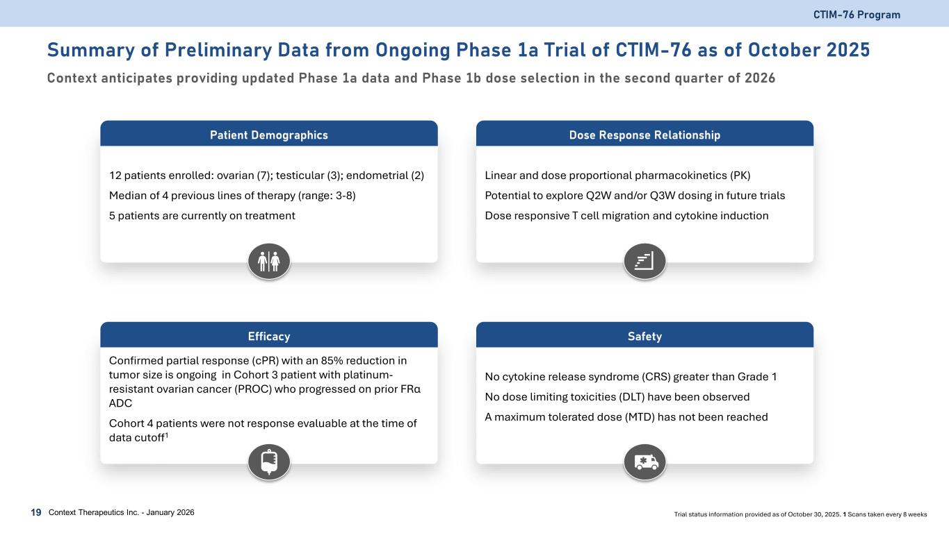 CTIM-76 Phase 1a/b Study An open-label, multi-center, dose escalation / expansion, safety, and PK study (NCT06515613) CTIM-76 Program 18 Context Therapeutics Inc. - January 2026 22.5  70 µg 70  140 µg 140  280 µg 140  560 µg TBD  1,120 µg If required If required Cohort 1 Cohort 2 Cohort 3 Cohort 4 Cohort 5 Cohort 6 Cohort 7 Cohort 8 EC50 ≈ 200 µg 22.5 µg MABEL Dose Completed (n=1) Completed (n=3) Completed (n=4) Completed (n=4) Enrolling (n≥3) Target population • Ovarian, endometrial and testicular cancer relapsed to standard of care • CLDN6+ positive via IHC (≥10% 1+ staining) Trial objectives • Assess safety and tolerability at increasing dose levels • Pharmacokinetic and pharmacodynamic data • Evaluate preliminary anti-tumor activity Dosing and Administration • Weekly IV infusion • Single step dose • Pretreat patients with 16 mg dexamethasone 1 hour prior to C1D1 and C1D8 doses Phase 1a Dose Escalation Trial status information provided as of January 5, 2026