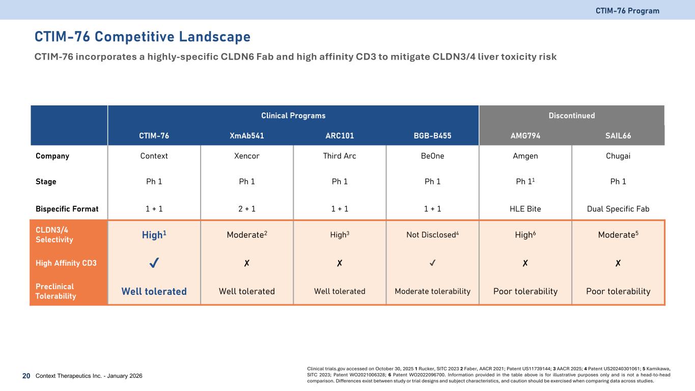 Clinical Programs Discontinued CTIM-76 XmAb541 ARC101 BGB-B455 AMG794 SAIL66 Company Context Xencor Third Arc BeOne Amgen Chugai Stage Ph 1 Ph 1 Ph 1 Ph 1 Ph 11 Ph 1 Bispecific Format 1 + 1 2 + 1 1 + 1 1 + 1 HLE Bite Dual Specific Fab CLDN3/4 Selectivity High1 Moderate2 High3 Not Disclosed4 High6 Moderate5 High Affinity CD3 ✘ ✘ ✘ ✘ Preclinical Tolerability Well tolerated Well tolerated Well tolerated Moderate tolerability Poor tolerability Poor tolerability CTIM-76 Program 20 Clinical trials.gov accessed on October 30, 2025 1 Rucker, SITC 2023 2 Faber, AACR 2021; Patent US11739144; 3 AACR 2025; 4 Patent US20240301061; 5 Kamikawa, SITC 2023; Patent WO2021006328; 6 Patent WO2022096700. Information provided in the table above is for illustrative purposes only and is not a head-to-head comparison. Differences exist between study or trial designs and subject characteristics, and caution should be exercised when comparing data across studies. Context Therapeutics Inc. - January 2026 CTIM-76 Competitive Landscape CTIM-76 incorporates a highly-specific CLDN6 Fab and high affinity CD3 to mitigate CLDN3/4 liver toxicity risk