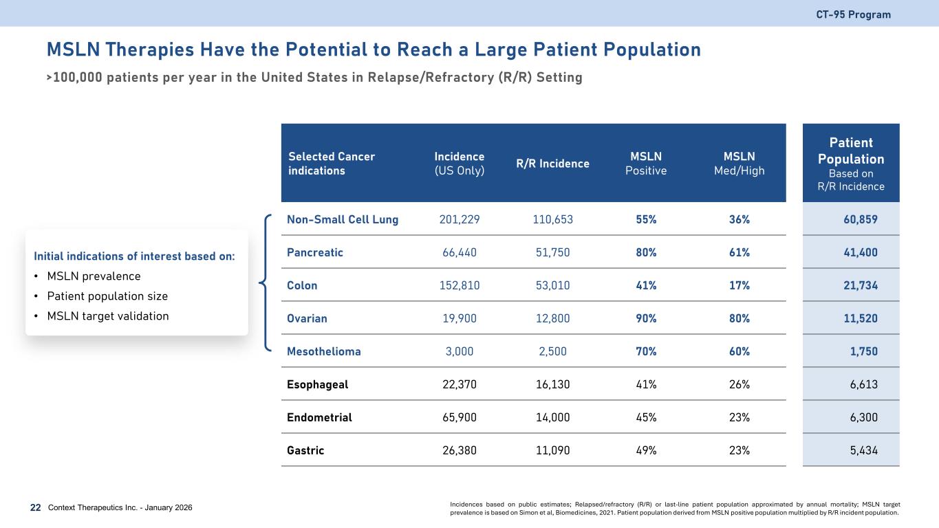 MSLN Therapies Have the Potential to Reach a Large Patient Population >100,000 patients per year in the United States in Relapse/Refractory (R/R) Setting CT-95 Program 22 Context Therapeutics Inc. - January 2026 Selected Cancer indications Incidence (US Only) R/R Incidence MSLN Positive MSLN Med/High Patient Population Based on R/R Incidence Non-Small Cell Lung 201,229 110,653 55% 36% 60,859 Pancreatic 66,440 51,750 80% 61% 41,400 Colon 152,810 53,010 41% 17% 21,734 Ovarian 19,900 12,800 90% 80% 11,520 Mesothelioma 3,000 2,500 70% 60% 1,750 Esophageal 22,370 16,130 41% 26% 6,613 Endometrial 65,900 14,000 45% 23% 6,300 Gastric 26,380 11,090 49% 23% 5,434 Incidences based on public estimates; Relapsed/refractory (R/R) or last-line patient population approximated by annual mortality; MSLN target prevalence is based on Simon et al, Biomedicines, 2021. Patient population derived from MSLN positive population multiplied by R/R incident population. Initial indications of interest based on: • MSLN prevalence • Patient population size • MSLN target validation