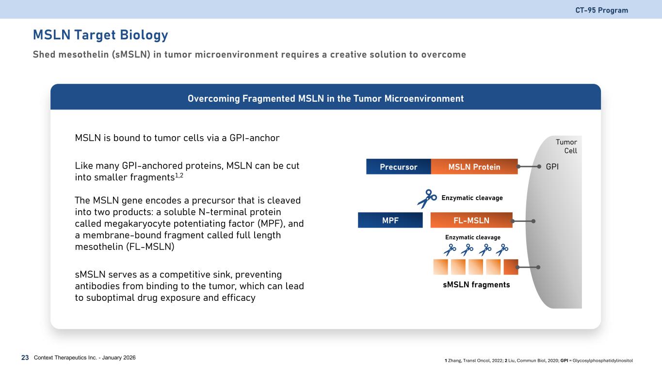 MSLN Target Biology Shed mesothelin (sMSLN) in tumor microenvironment requires a creative solution to overcome CT-95 Program Context Therapeutics Inc. - January 202623 MSLN is bound to tumor cells via a GPI-anchor Like many GPI-anchored proteins, MSLN can be cut into smaller fragments1,2 The MSLN gene encodes a precursor that is cleaved into two products: a soluble N-terminal protein called megakaryocyte potentiating factor (MPF), and a membrane-bound fragment called full length mesothelin (FL-MSLN) sMSLN serves as a competitive sink, preventing antibodies from binding to the tumor, which can lead to suboptimal drug exposure and efficacy Overcoming Fragmented MSLN in the Tumor Microenvironment 1 Zhang, Transl Oncol, 2022; 2 Liu, Commun Biol, 2020; GPI = Glycosylphosphatidylinositol Precursor MSLN Protein FL-MSLNMPF Tumor Cell Enzymatic cleavage GPI sMSLN fragments Enzymatic cleavage