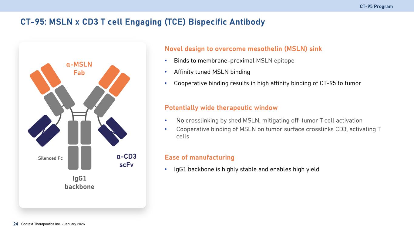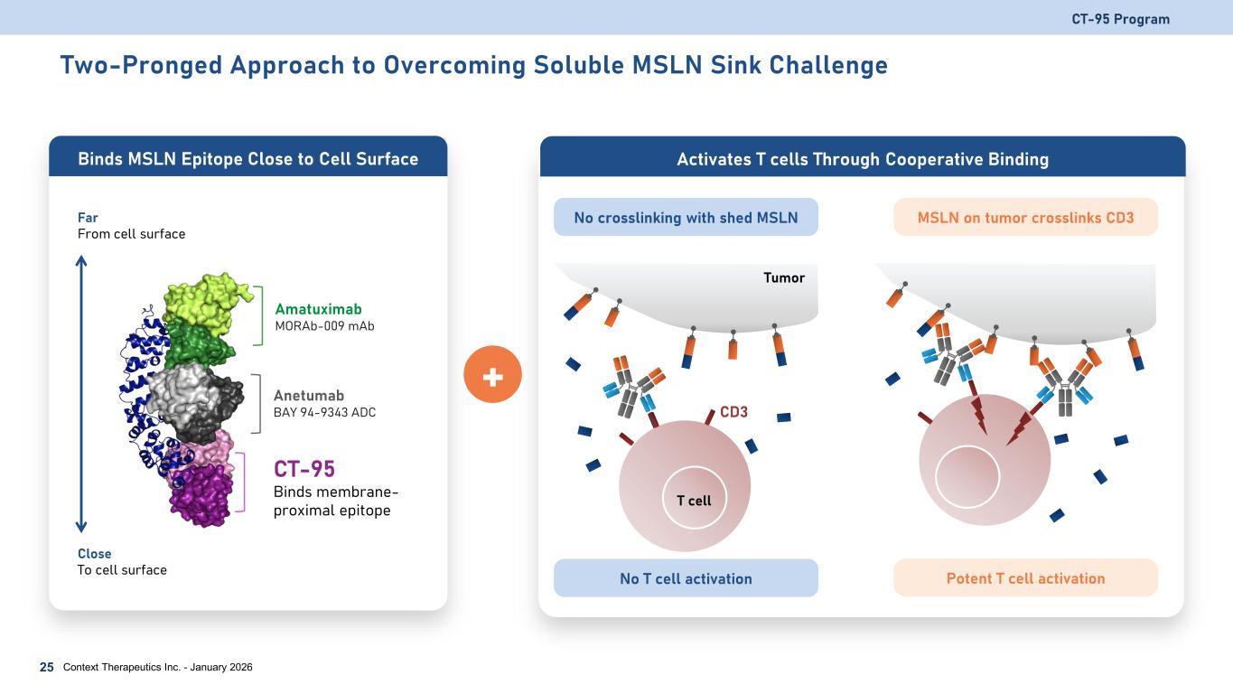 CT-95: MSLN x CD3 T cell Engaging (TCE) Bispecific Antibody Novel design to overcome mesothelin (MSLN) sink • Binds to membrane-proximal MSLN epitope • Affinity tuned MSLN binding • Cooperative binding results in high affinity binding of CT-95 to tumor Potentially wide therapeutic window • No crosslinking by shed MSLN, mitigating off-tumor T cell activation • Cooperative binding of MSLN on tumor surface crosslinks CD3, activating T cells Ease of manufacturing • IgG1 backbone is highly stable and enables high yield CT-95 Program Context Therapeutics Inc. - January 202624 α-MSLN Fab α-CD3 scFv IgG1 backbone Silenced Fc