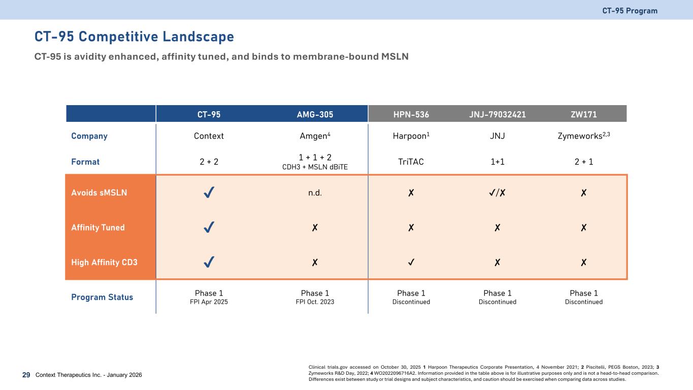 CT-95 Phase 1a/b Study An open-label, multi-center, dose escalation / expansion, safety, and PK study (NCT06756035) CT-95 Program 28 Context Therapeutics Inc. - January 2026 Trial status information provided as of January 5, 2026 0.3 µg/kg 0.18  0.6 µg/kg 0.27  0.9 µg/kg 0.36  1.2 µg/kg 0.48  1.6 µg/kg 0.6  2.0 µg/kg 0.6  TBD µg/kg Cohort 1 Cohort 2 Cohort 3 Cohort 4 Cohort 5 Cohort 6 Cohort 7 Cohort 8 EC50 ≈ 0.9 µg/kg 0.1 µg/kg MABEL Dose Completed (n=1) Completed (n=4) Phase 1a Dose EscalationBiomarker stratification • Ovarian, pancreatic, and mesothelioma do not require prospective screening • All other indications require prospective MSLN screening via IHC (≥10% 1+ staining) Trial objectives • Assess safety and tolerability at increasing dose levels • Pharmacokinetic and pharmacodynamic data • Evaluate preliminary anti-tumor activity Dosing and Administration • Weekly IV infusion • Single step dose • Pretreat patients with 10 mg dexamethasone 1 hour prior to C1D1 and C1D8 doses Enrolling (n≥3) Completed (n=3)