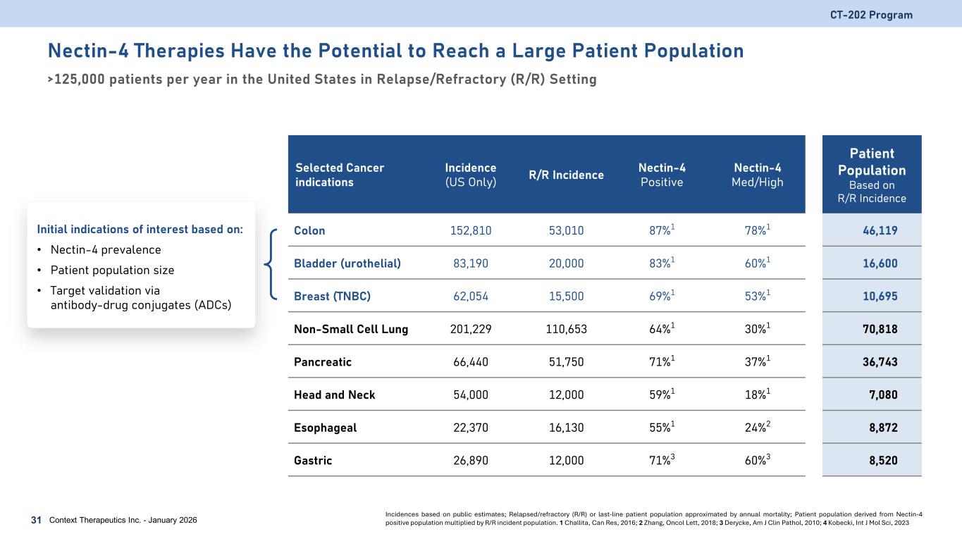 Nectin-4 Therapies Have the Potential to Reach a Large Patient Population >125,000 patients per year in the United States in Relapse/Refractory (R/R) Setting CT-202 Program 31 Context Therapeutics Inc. - January 2026 Selected Cancer indications Incidence (US Only) R/R Incidence Nectin-4 Positive Nectin-4 Med/High Patient Population Based on R/R Incidence Colon 152,810 53,010 87%1 78%1 46,119 Bladder (urothelial) 83,190 20,000 83%1 60%1 16,600 Breast (TNBC) 62,054 15,500 69%1 53%1 10,695 Non-Small Cell Lung 201,229 110,653 64%1 30%1 70,818 Pancreatic 66,440 51,750 71%1 37%1 36,743 Head and Neck 54,000 12,000 59%1 18%1 7,080 Esophageal 22,370 16,130 55%1 24%2 8,872 Gastric 26,890 12,000 71%3 60%3 8,520 Initial indications of interest based on: • Nectin-4 prevalence • Patient population size • Target validation via antibody-drug conjugates (ADCs) Incidences based on public estimates; Relapsed/refractory (R/R) or last-line patient population approximated by annual mortality; Patient population derived from Nectin-4 positive population multiplied by R/R incident population. 1 Challita, Can Res, 2016; 2 Zhang, Oncol Lett, 2018; 3 Derycke, Am J Clin Pathol, 2010; 4 Kobecki, Int J Mol Sci, 2023