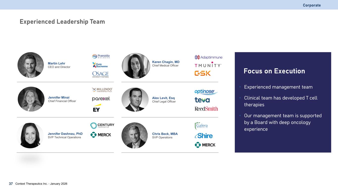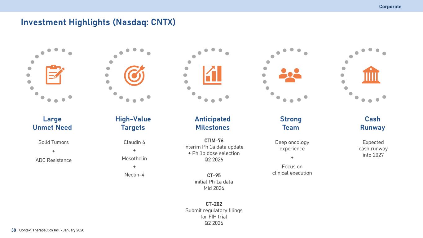 Corporate Experienced Leadership Team • Experienced management team • Clinical team has developed T cell therapies • Our management team is supported by a Board with deep oncology experience Focus on Execution Martin Lehr CEO and Director Alex Levit, Esq Chief Legal Officer Karen Chagin, MD Chief Medical Officer Context Therapeutics Inc. - January 202637 Jennifer Dashnau, PhD SVP Technical Operations Jennifer Minai Chief Financial Officer Chris Beck, MBA SVP Operations