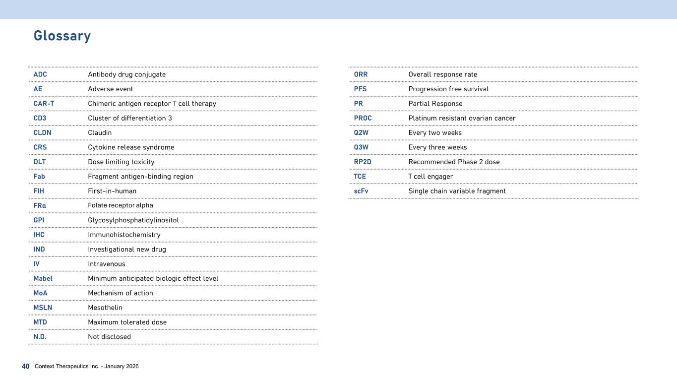 Glossary ADC Antibody drug conjugate AE Adverse event CAR-T Chimeric antigen receptor T cell therapy CD3 Cluster of differentiation 3 CLDN Claudin CRS Cytokine release syndrome DLT Dose limiting toxicity Fab Fragment antigen-binding region FIH First-in-human FRα Folate receptor alpha GPI Glycosylphosphatidylinositol IHC Immunohistochemistry IND Investigational new drug IV Intravenous Mabel Minimum anticipated biologic effect level MoA Mechanism of action MSLN Mesothelin MTD Maximum tolerated dose N.D. Not disclosed Context Therapeutics Inc. - January 202640 ORR Overall response rate PFS Progression free survival PR Partial Response PROC Platinum resistant ovarian cancer Q2W Every two weeks Q3W Every three weeks RP2D Recommended Phase 2 dose TCE T cell engager scFv Single chain variable fragment