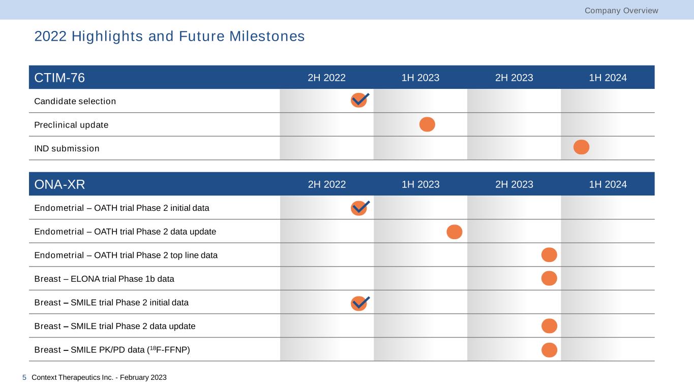 Pipeline Highlights 4 1 Tyligand Biosciences Ltd licensed rights to ONA-XR in China, HK, Macau * Investigator Sponsored Trial Cancer Clinical Indication Preclinical Phase 1 Clinical Phase 2 Clinical Milestones CTIM-76 (CLDN6xCD3 bispecific antibody) CLDN6-positive cancers Candidate selection Q4 2022 Preclinical update Q2 2023 IND filing in Q1 2024 ONA-XR (PR antagonist)1 Endometrial Cancer Recurrent PR+ Endometrioid Combination with anastrozole in post-chemotherapy treated patients Initial data Q4 2022 Data update Q2 2023 Breast Cancer 2L/3L ER+,PR+,HER2- Combination with ORSERDU (elacestrant) in post-CDK4/6 inhibitor treated patients Initiated Q4 2022 Phase 1b data Q4 2023 2L/3L ER+,HER2- Combination with fulvestrant in post-CDK4/6 inhibitor treated patients Initial data Q4 2022 Data update Q4 2023 Phase 1b/2 ELONA Trial Phase 2 SMILE Trial* Phase 2 OATH Trial* Company Overview Context Therapeutics Inc. - February 2023