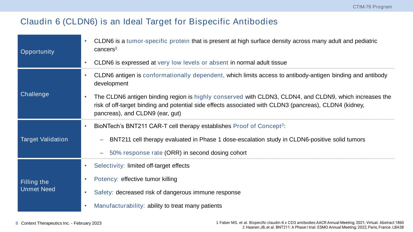 Emerging Role of Bispecific Antibodies in Treating Solid Tumors Harnessing the Immune System to Attack Solid Tumors • A challenge for targeting solid tumors is that many tumor-associated antigens are also expressed on normal tissues, raising concerns about “on-target off-tumor” toxicities • Bispecific antibodies (BsAbs) are antibodies with two binding sites directed at two different targets, which can be exploited for targeting a tumor cell (e.g., CLDN6) and an immune cell (e.g., CD3) • Compared with monoclonal antibodies, bispecific antibodies not only have stronger specificity, better targeting ability and lower off-target toxicity, but also can effectively prevent drug resistance, reduce treatment costs and improve patient access to drugs, achieving a superior therapeutic effect Bispecific Antibodies are a Hot Field for Drug Development • Over 50 CD3 bispecific T-cell engagers in clinical development • Common solid cancer targets include Claudin 18.2, DLL, GPC3, HER2, PSMA • 9 BsAbs are currently approved worldwide and business development activity for BsAbs was particularly robust in 2022 CTIM-76 Program Context Therapeutics Inc. - February 20237 Licensee Licensor Target Asset Stage Geography Upfront ($M) Milestones($M) TeneoTwo AstraZeneca CD19 x CD3 TNB-486 Phase 1 Worldwide $100 $1,165 Macrogenics Gilead CD123 x CD3 MGD024 IND Worldwide $60 $1,700 LAVA Seagen EGFR x γδ T cell LAVA-1223 Preclinical Worldwide $50 $650 Harbour AstraZeneca Claudin 18.2 x CD3 HBM7022 Preclinical Worldwide $25 $350 1 Representative transactions based on publicly available information and represents a non-head-to-head summary comparison Select Early-stage Bispecific Antibody Transactions in 20221
