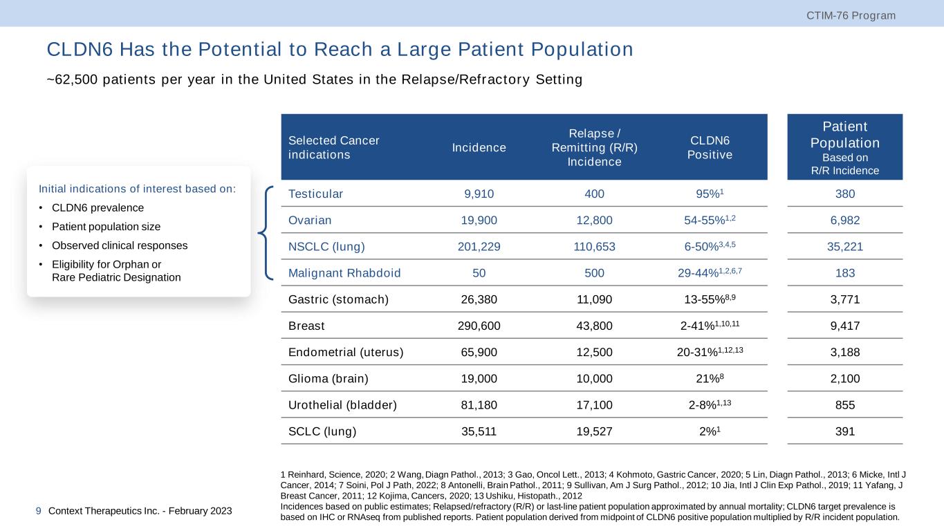 Claudin 6 (CLDN6) is an Ideal Target for Bispecific Antibodies Opportunity • CLDN6 is a tumor-specific protein that is present at high surface density across many adult and pediatric cancers1 • CLDN6 is expressed at very low levels or absent in normal adult tissue Challenge • CLDN6 antigen is conformationally dependent, which limits access to antibody-antigen binding and antibody development • The CLDN6 antigen binding region is highly conserved with CLDN3, CLDN4, and CLDN9, which increases the risk of off-target binding and potential side effects associated with CLDN3 (pancreas), CLDN4 (kidney, pancreas), and CLDN9 (ear, gut) Target Validation • BioNTech’s BNT211 CAR-T cell therapy establishes Proof of Concept2: ‒ BNT211 cell therapy evaluated in Phase 1 dose-escalation study in CLDN6-positive solid tumors ‒ 50% response rate (ORR) in second dosing cohort Filling the Unmet Need • Selectivity: limited off-target effects • Potency: effective tumor killing • Safety: decreased risk of dangerous immune response • Manufacturability: ability to treat many patients CTIM-76 Program Context Therapeutics Inc. - February 20238 1 Faber MS, et al. Bispecific claudin-6 x CD3 antibodies AACR Annual Meeting; 2021; Virtual. Abstract 1860 2 Haanen JB, et al. BNT211: A Phase I trial. ESMO Annual Meeting; 2022; Paris, France. LBA38