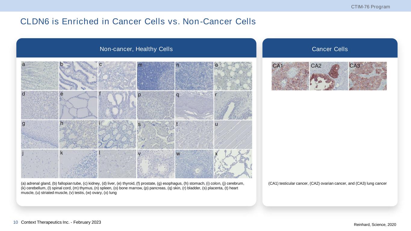 CLDN6 is Enriched in Cancer Cells vs. Non-Cancer Cells CTIM-76 Program Context Therapeutics Inc. - February 202310 (a) adrenal gland, (b) fallopian tube, (c) kidney, (d) liver, (e) thyroid, (f) prostate, (g) esophagus, (h) stomach, (i) colon, (j) cerebrum, (k) cerebellum, (l) spinal cord, (m) thymus, (n) spleen, (o) bone marrow, (p) pancreas, (q) skin, (r) bladder, (s) placenta, (t) heart muscle, (u) striated muscle, (v) testis, (w) ovary, (x) lung (CA1) testicular cancer, (CA2) ovarian cancer, and (CA3) lung cancer Reinhard, Science, 2020 Non-cancer, Healthy Cells Cancer Cells