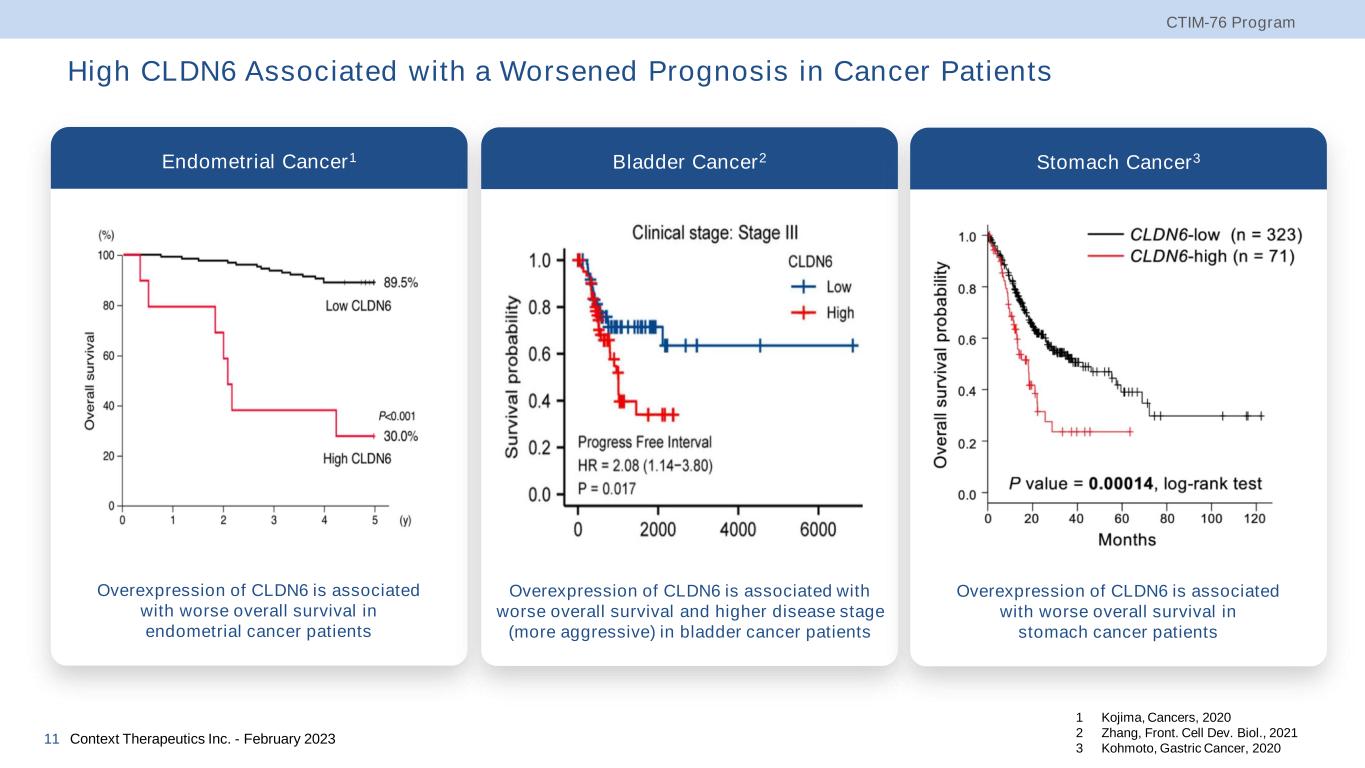 High CLDN6 Associated with a Worsened Prognosis in Cancer Patients CTIM-76 Program Context Therapeutics Inc. - February 202311 Endometrial Cancer1 Overexpression of CLDN6 is associated with worse overall survival in endometrial cancer patients 1 Kojima, Cancers, 2020 2 Zhang, Front. Cell Dev. Biol., 2021 3 Kohmoto, Gastric Cancer, 2020 Bladder Cancer2 Overexpression of CLDN6 is associated with worse overall survival and higher disease stage (more aggressive) in bladder cancer patients Stomach Cancer3 Overexpression of CLDN6 is associated with worse overall survival in stomach cancer patients