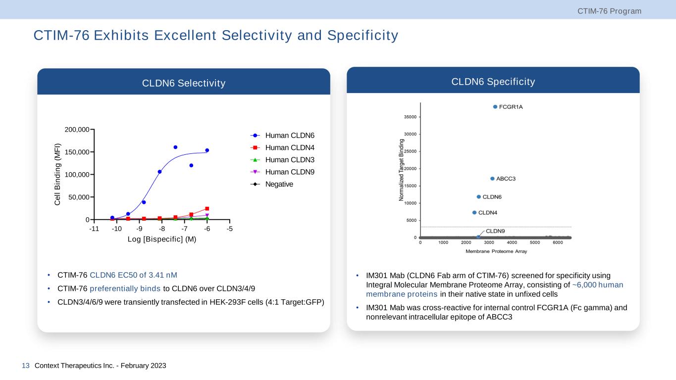 CTIM-76: Claudin 6 x CD3 Bispecific Antibody Wide therapeutic window • Highly selective CLDN6 binding fragment antibody-binding (Fab) arm • Immunostimulatory CD3 binding single-chain fragment variable (scFv) domain is designed to be functionally monovalent to avoid aberrant T-cell activation, potentially enhancing safety profile • The fragment crystallizable region (Fc region) is the tail region of an antibody that interacts with cell surface receptors called Fc receptors. A mutation has been inserted into the Fc domain to silence the Fc domain function and avoid T-cell activation by Fc-gamma receptor positive cells Convenient dosing with low immunogenicity risk • T-cell dependent cellular cytotoxicity with no or minimal activation of circulating cytokines • Humanized CLDN6 and CD3 binding domains Ease of manufacturing • IgG backbone is highly stable and enables high yield CTIM-76 Program Context Therapeutics Inc. - February 202312 α-CLDN6 Fab α-CD3 scFv IgG backbone Fc