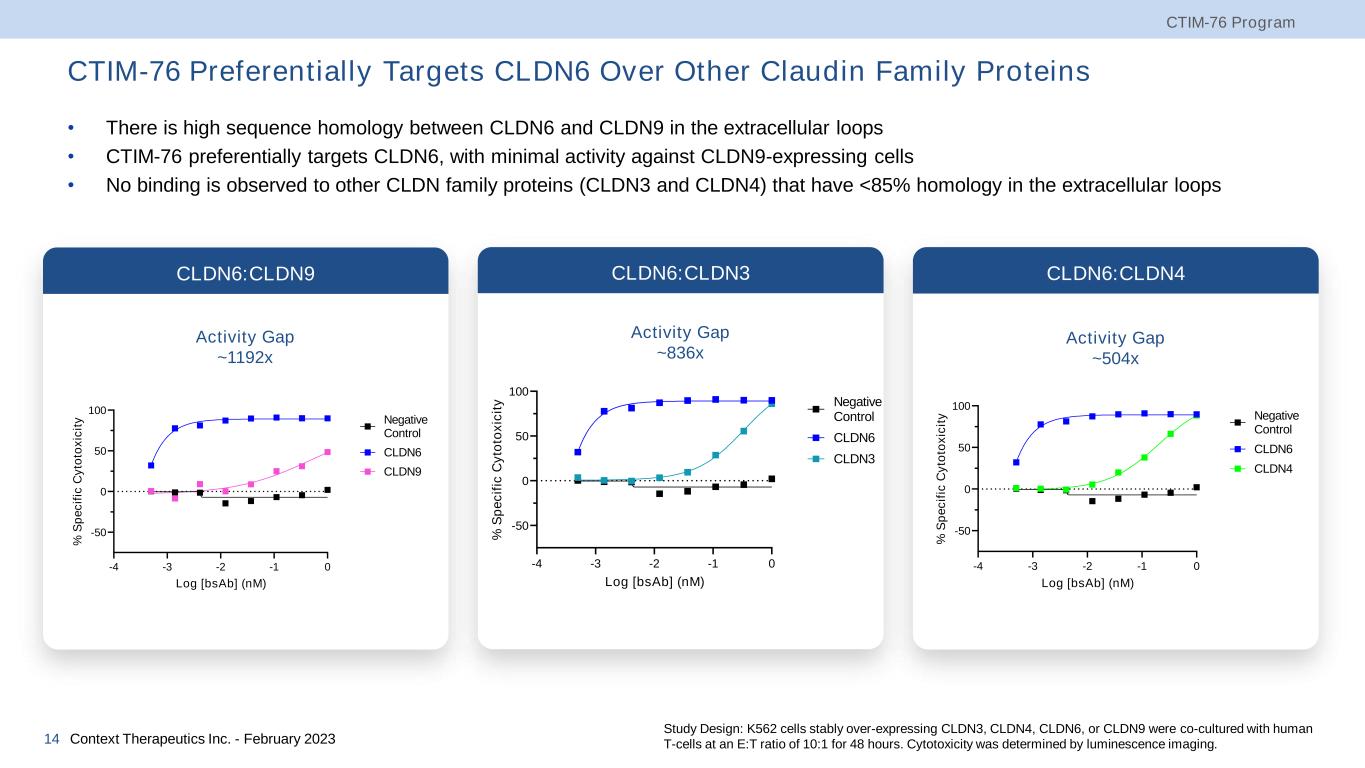 CTIM-76 Exhibits Excellent Selectivity and Specificity CTIM-76 Program Context Therapeutics Inc. - February 202313 • IM301 Mab (CLDN6 Fab arm of CTIM-76) screened for specificity using Integral Molecular Membrane Proteome Array, consisting of ~6,000 human membrane proteins in their native state in unfixed cells • IM301 Mab was cross-reactive for internal control FCGR1A (Fc gamma) and nonrelevant intracellular epitope of ABCC3 • CTIM-76 CLDN6 EC50 of 3.41 nM • CTIM-76 preferentially binds to CLDN6 over CLDN3/4/9 • CLDN3/4/6/9 were transiently transfected in HEK-293F cells (4:1 Target:GFP) CLDN6 Selectivity CLDN6 Specificity -11 -10 -9 -8 -7 -6 -5 0 50,000 100,000 150,000 200,000 Log [Bispecific] (M) C e ll B in d in g ( M F I) Human CLDN6 Human CLDN4 Human CLDN3 Human CLDN9 Negative