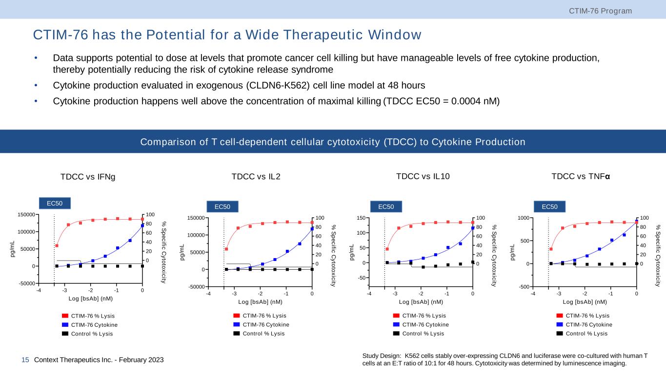 CTIM-76 Preferentially Targets CLDN6 Over Other Claudin Family Proteins CTIM-76 Program Context Therapeutics Inc. - February 202314 • There is high sequence homology between CLDN6 and CLDN9 in the extracellular loops • CTIM-76 preferentially targets CLDN6, with minimal activity against CLDN9-expressing cells • No binding is observed to other CLDN family proteins (CLDN3 and CLDN4) that have <85% homology in the extracellular loops Study Design: K562 cells stably over-expressing CLDN3, CLDN4, CLDN6, or CLDN9 were co-cultured with human T-cells at an E:T ratio of 10:1 for 48 hours. Cytotoxicity was determined by luminescence imaging. CLDN6:CLDN3 CLDN6:CLDN4 -4 -3 -2 -1 0 -50 0 50 100 Log [bsAb] (nM) % S p e c if ic C y to to x ic it y Negative Control CLDN6 CLDN3 -4 -3 -2 -1 0 -50 0 50 100 Log [bsAb] (nM) % S p e c if ic C y to to x ic it y Negative Control CLDN6 CLDN4 Activity Gap ~836x Activity Gap ~504x CLDN6:CLDN9 -4 -3 -2 -1 0 -50 0 50 100 Log [bsAb] (nM) % S p e c if ic C y to to x ic it y Negative Control CLDN6 CLDN9 Activity Gap ~1192x