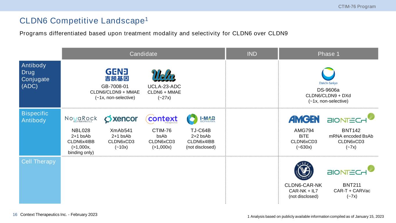 CTIM-76 Program Context Therapeutics Inc. - February 202315 CTIM-76 has the Potential for a Wide Therapeutic Window • Data supports potential to dose at levels that promote cancer cell killing but have manageable levels of free cytokine production, thereby potentially reducing the risk of cytokine release syndrome • Cytokine production evaluated in exogenous (CLDN6-K562) cell line model at 48 hours • Cytokine production happens well above the concentration of maximal killing (TDCC EC50 = 0.0004 nM) CTIM-76 Cytokine Control % Lysis CTIM-76 % Lysis TDCC vs IL2 -4 -3 -2 -1 0 -50000 0 50000 100000 150000 0 20 40 60 80 100 Log [bsAb] (nM) p g /m L % S p e c ific C y to to x ic ity EC50 TDCC vs IFNg EC50 -4 -3 -2 -1 0 -50000 0 50000 100000 150000 0 20 40 60 80 100 Log [bsAb] (nM) p g /m L % S p e c ific C y to to x ic ity TDCC vs TNFα EC50 -4 -3 -2 -1 0 -500 0 500 1000 0 20 40 60 80 100 Log [bsAb] (nM) p g /m L % S p e c ific C y to to x ic ity TDCC vs IL10 EC50 -4 -3 -2 -1 0 -50 0 50 100 150 0 20 40 60 80 100 Log [bsAb] (nM) p g /m L % S p e c ific C y to to x ic ity Study Design: K562 cells stably over-expressing CLDN6 and luciferase were co-cultured with human T cells at an E:T ratio of 10:1 for 48 hours. Cytotoxicity was determined by luminescence imaging. CTIM-76 Cytokine Control % Lysis CTIM-76 % Lysis CTIM-76 Cytokine Control % Lysis CTIM-76 % Lysis CTIM-76 Cytokine Control % Lysis CTIM-76 % Lysis Comparison of T cell-dependent cellular cytotoxicity (TDCC) to Cytokine Production
