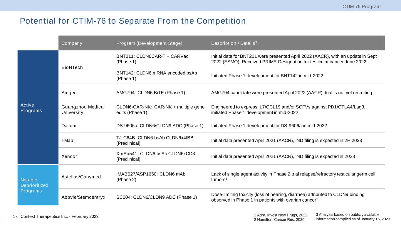 CLDN6 Competitive Landscape1 Programs differentiated based upon treatment modality and selectivity for CLDN6 over CLDN9 CTIM-76 Program Context Therapeutics Inc. - February 202316 Candidate IND Phase 1 Antibody Drug Conjugate (ADC) Bispecific Antibody Cell Therapy CLDN6-CAR-NK CAR-NK + IL7 (not disclosed) BNT211 CAR-T + CARVac (~7x) TJ-C64B 2+2 bsAb CLDN6x4IBB (not disclosed) UCLA-23-ADC CLDN6 + MMAE (~27x) AMG794 BiTE CLDN6xCD3 (~630x) BNT142 mRNA encoded BsAb CLDN6xCD3 (~7x) XmAb541 2+1 bsAb CLDN6xCD3 (~10x) CTIM-76 bsAb CLDN6xCD3 (>1,000x) DS-9606a CLDN6/CLDN9 + DXd (~1x, non-selective) NBL028 2+1 bsAb CLDN6x4IBB (>1,000x, binding only) GB-7008-01 CLDN6/CLDN9 + MMAE (~1x, non-selective) 1 Analysis based on publicly available information compiled as of January 15, 2023