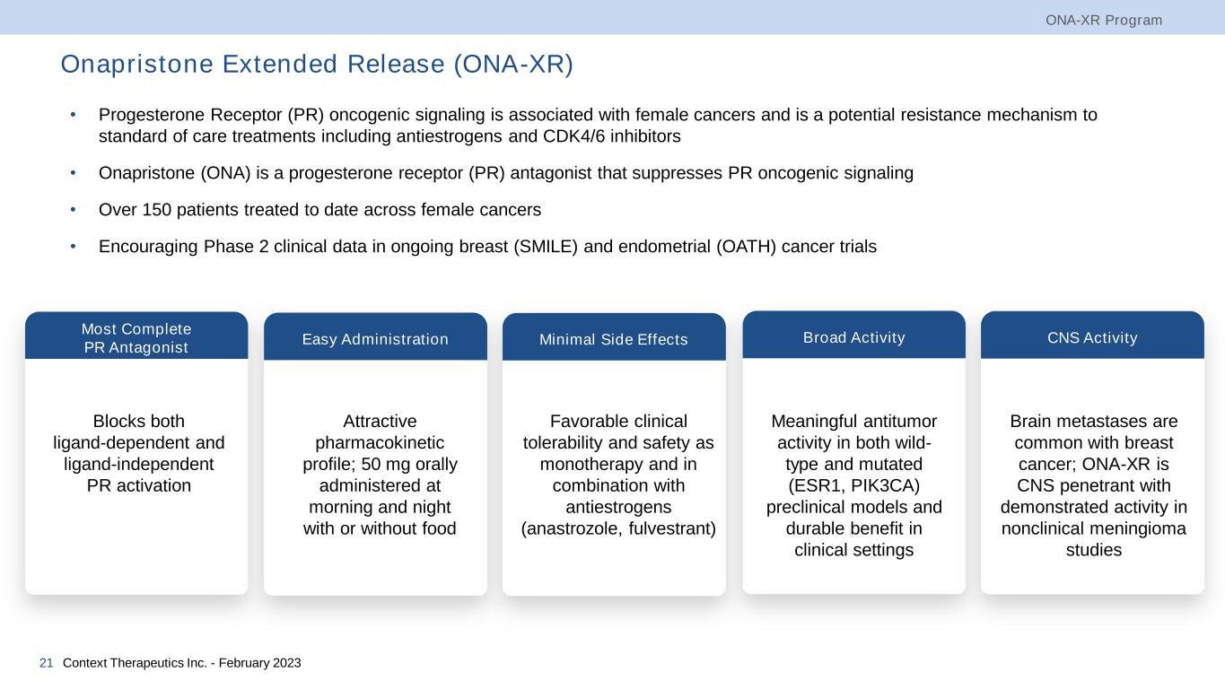 ONA-XR Progesterone Receptor Antagonist for Female Cancers 19 Contex t Therapeut ics Inc. - February 2023