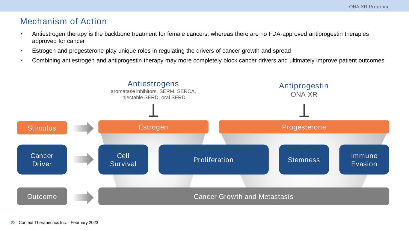 Onapristone Extended Release (ONA-XR) • Progesterone Receptor (PR) oncogenic signaling is associated with female cancers and is a potential resistance mechanism to standard of care treatments including antiestrogens and CDK4/6 inhibitors • Onapristone (ONA) is a progesterone receptor (PR) antagonist that suppresses PR oncogenic signaling • Over 150 patients treated to date across female cancers • Encouraging Phase 2 clinical data in ongoing breast (SMILE) and endometrial (OATH) cancer trials ONA-XR Program Context Therapeutics Inc. - February 202321 Blocks both ligand-dependent and ligand-independent PR activation Attractive pharmacokinetic profile; 50 mg orally administered at morning and night with or without food Favorable clinical tolerability and safety as monotherapy and in combination with antiestrogens (anastrozole, fulvestrant) Meaningful antitumor activity in both wild- type and mutated (ESR1, PIK3CA) preclinical models and durable benefit in clinical settings Brain metastases are common with breast cancer; ONA-XR is CNS penetrant with demonstrated activity in nonclinical meningioma studies Most Complete PR Antagonist Easy Administration Minimal Side Effects Broad Activity CNS Activity