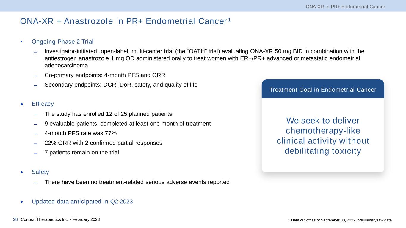 Endometrial Cancer Patient Treatment Landscape1 ONA-XR in PR+ Endometrial Cancer Context Therapeutics Inc. - February 202327 Primary Adjuvant 1L Watchful Waiting 2L 3L • Chemotherapy• Chemotherapy • Radiotherapy • Chemotherapy • Lenvima + Keytruda • CPI (MSI-H, dMMR) • Antiestrogen • Clinical trials • Standard of Care (SOC) is carboplatin + paclitaxel • mPFS of ~12 months • Treatment goal is disease stabilization for 4-6 months • Lenvima + Keytruda poor tolerability associated with high discontinuation rate in patients First Line (1L) Second Line (2L)1L 2L Potential Target Indications for ONA-XR • Limited treatment options Third Line (3L)3L • No approved therapies • Treatment goal is disease stabilization for ≥4 months and to provide a high quality of life Maintenance LineM 1 National Comprehensive Cancer Network Clinical Practice Guidelines in Oncology. Uterine Neoplasms. v4.2021 • Surgical debulking Disease Recurrence Complete Response Residual Tumor Burden 20% of Patients 80% of Patients