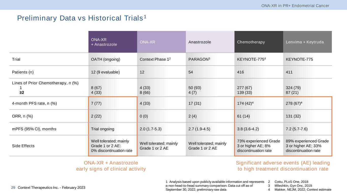 ONA-XR + Anastrozole in PR+ Endometrial Cancer1 • Ongoing Phase 2 Trial ̶ Investigator-initiated, open-label, multi-center trial (the “OATH” trial) evaluating ONA-XR 50 mg BID in combination with the antiestrogen anastrozole 1 mg QD administered orally to treat women with ER+/PR+ advanced or metastatic endometrial adenocarcinoma ̶ Co-primary endpoints: 4-month PFS and ORR ̶ Secondary endpoints: DCR, DoR, safety, and quality of life • Efficacy ̶ The study has enrolled 12 of 25 planned patients ̶ 9 evaluable patients; completed at least one month of treatment ̶ 4-month PFS rate was 77% ̶ 22% ORR with 2 confirmed partial responses ̶ 7 patients remain on the trial • Safety ̶ There have been no treatment-related serious adverse events reported • Updated data anticipated in Q2 2023 ONA-XR in PR+ Endometrial Cancer Context Therapeutics Inc. - February 202328 1 Data cut off as of September 30, 2022; preliminary raw data Treatment Goal in Endometrial Cancer We seek to deliver chemotherapy-like clinical activity without debilitating toxicity