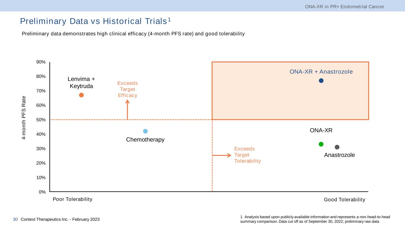 Preliminary Data vs Historical Trials1 ONA-XR in PR+ Endometrial Cancer Context Therapeutics Inc. - February 202329 1 Analysis based upon publicly available information and represents a non-head-to-head summary comparison. Data cut off as of September 30, 2022; preliminary raw data ONA-XR + Anastrozole ONA-XR Anastrozole Chemotherapy Lenvima + Keytruda Trial OATH (ongoing) Context Phase 12 PARAGON3 KEYNOTE-7754 KEYNOTE-775 Patients (n) 12 (9 evaluable) 12 54 416 411 Lines of Prior Chemotherapy, n (%) 1 ≥2 8 (67) 4 (33) 4 (33) 8 (66) 50 (93) 4 (7) 277 (67) 139 (33) 324 (79) 87 (21) 4-month PFS rate, n (%) 7 (77) 4 (33) 17 (31) 174 (42)4 278 (67)4 ORR, n (%) 2 (22) 0 (0) 2 (4) 61 (14) 131 (32) mPFS (95% CI), months Trial ongoing 2.0 (1.7-5.3) 2.7 (1.9-4.5) 3.8 (3.6-4.2) 7.2 (5.7-7.6) Side Effects Well tolerated; mainly Grade 1 or 2 AE: 0% discontinuation rate Well tolerated; mainly Grade 1 or 2 AE Well tolerated; mainly Grade 1 or 2 AE 73% experienced Grade 3 or higher AE; 8% discontinuation rate 89% experienced Grade 3 or higher AE; 33% discontinuation rate 2 Cottu, PLoS One, 2018 3 Mileshkin, Gyn Onc, 2019 4 Makker, NEJM, 2022; Context estimate ONA-XR + Anastrozole early signs of clinical activity Significant adverse events (AE) leading to high treatment discontinuation rate