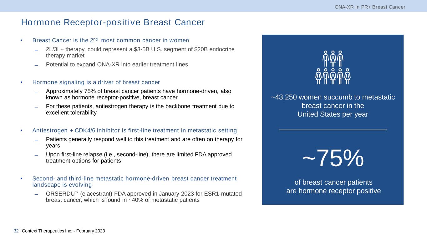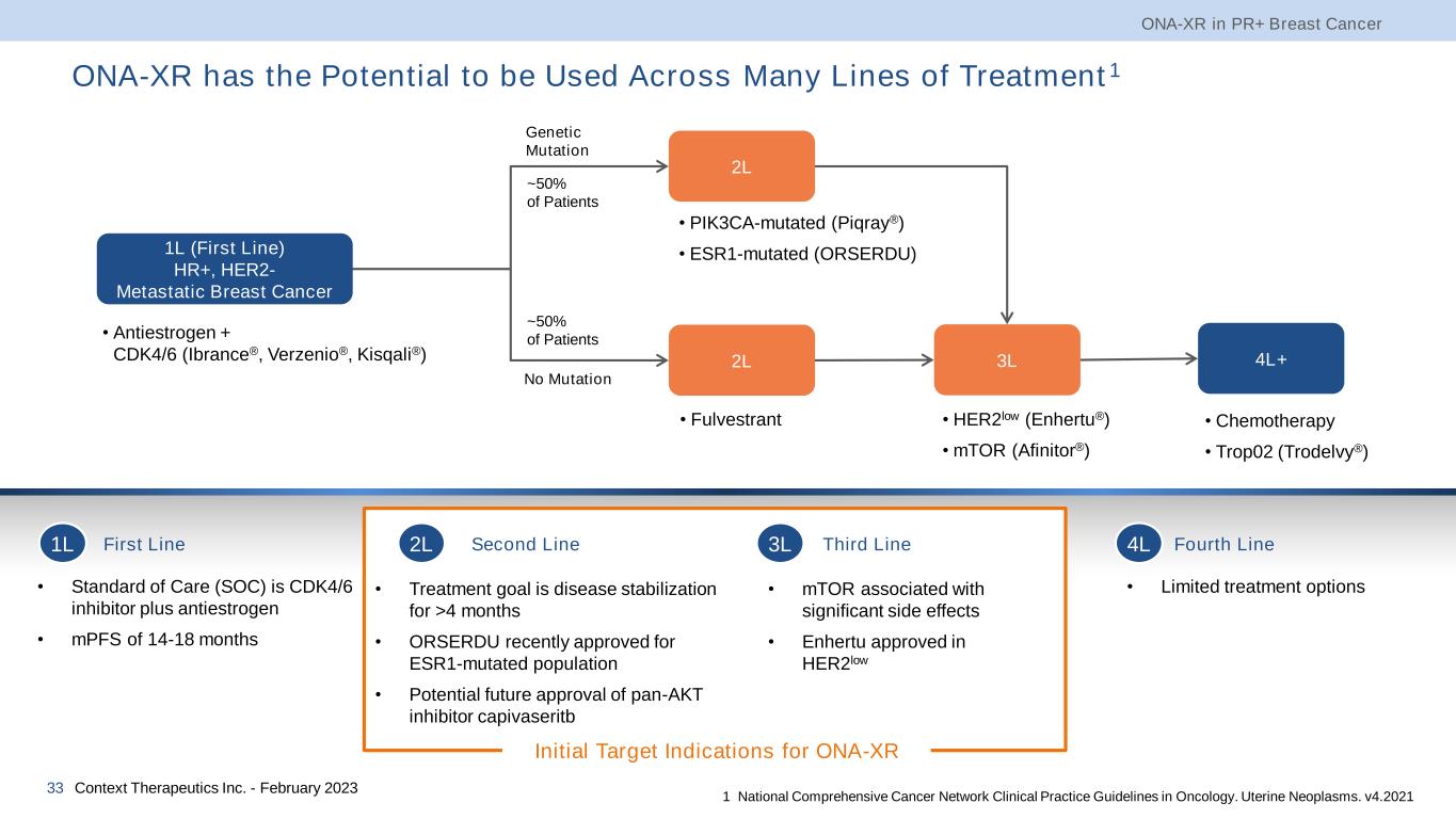 Hormone Receptor-positive Breast Cancer • Breast Cancer is the 2nd most common cancer in women ̶ 2L/3L+ therapy, could represent a $3-5B U.S. segment of $20B endocrine therapy market ̶ Potential to expand ONA-XR into earlier treatment lines • Hormone signaling is a driver of breast cancer ̶ Approximately 75% of breast cancer patients have hormone-driven, also known as hormone receptor-positive, breast cancer ̶ For these patients, antiestrogen therapy is the backbone treatment due to excellent tolerability • Antiestrogen + CDK4/6 inhibitor is first-line treatment in metastatic setting ̶ Patients generally respond well to this treatment and are often on therapy for years ̶ Upon first-line relapse (i.e., second-line), there are limited FDA approved treatment options for patients • Second- and third-line metastatic hormone-driven breast cancer treatment landscape is evolving ̶ ORSERDU™ (elacestrant) FDA approved in January 2023 for ESR1-mutated breast cancer, which is found in ~40% of metastatic patients ONA-XR in PR+ Breast Cancer Context Therapeutics Inc. - February 202332 ~43,250 women succumb to metastatic breast cancer in the United States per year of breast cancer patients are hormone receptor positive ~75%