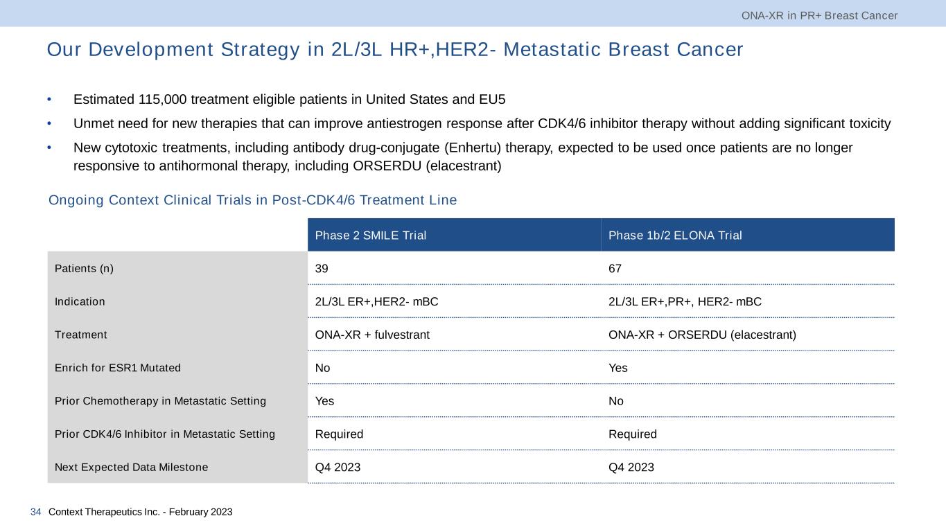 ONA-XR has the Potential to be Used Across Many Lines of Treatment1 ONA-XR in PR+ Breast Cancer Context Therapeutics Inc. - February 202333 1L (First Line) HR+, HER2- Metastatic Breast Cancer 2L 2L 3L • Antiestrogen + CDK4/6 (Ibrance®, Verzenio®, Kisqali®) • Fulvestrant • HER2low (Enhertu®) • mTOR (Afinitor®) • Standard of Care (SOC) is CDK4/6 inhibitor plus antiestrogen • mPFS of 14-18 months • Treatment goal is disease stabilization for >4 months • ORSERDU recently approved for ESR1-mutated population • Potential future approval of pan-AKT inhibitor capivaseritb First Line Second Line1L 2L Initial Target Indications for ONA-XR • Limited treatment options Fourth Line4L • mTOR associated with significant side effects • Enhertu approved in HER2low Third Line3L 1 National Comprehensive Cancer Network Clinical Practice Guidelines in Oncology. Uterine Neoplasms. v4.2021 Genetic Mutation No Mutation ~50% of Patients ~50% of Patients 4L+ • PIK3CA-mutated (Piqray®) • ESR1-mutated (ORSERDU) • Chemotherapy • Trop02 (Trodelvy®)