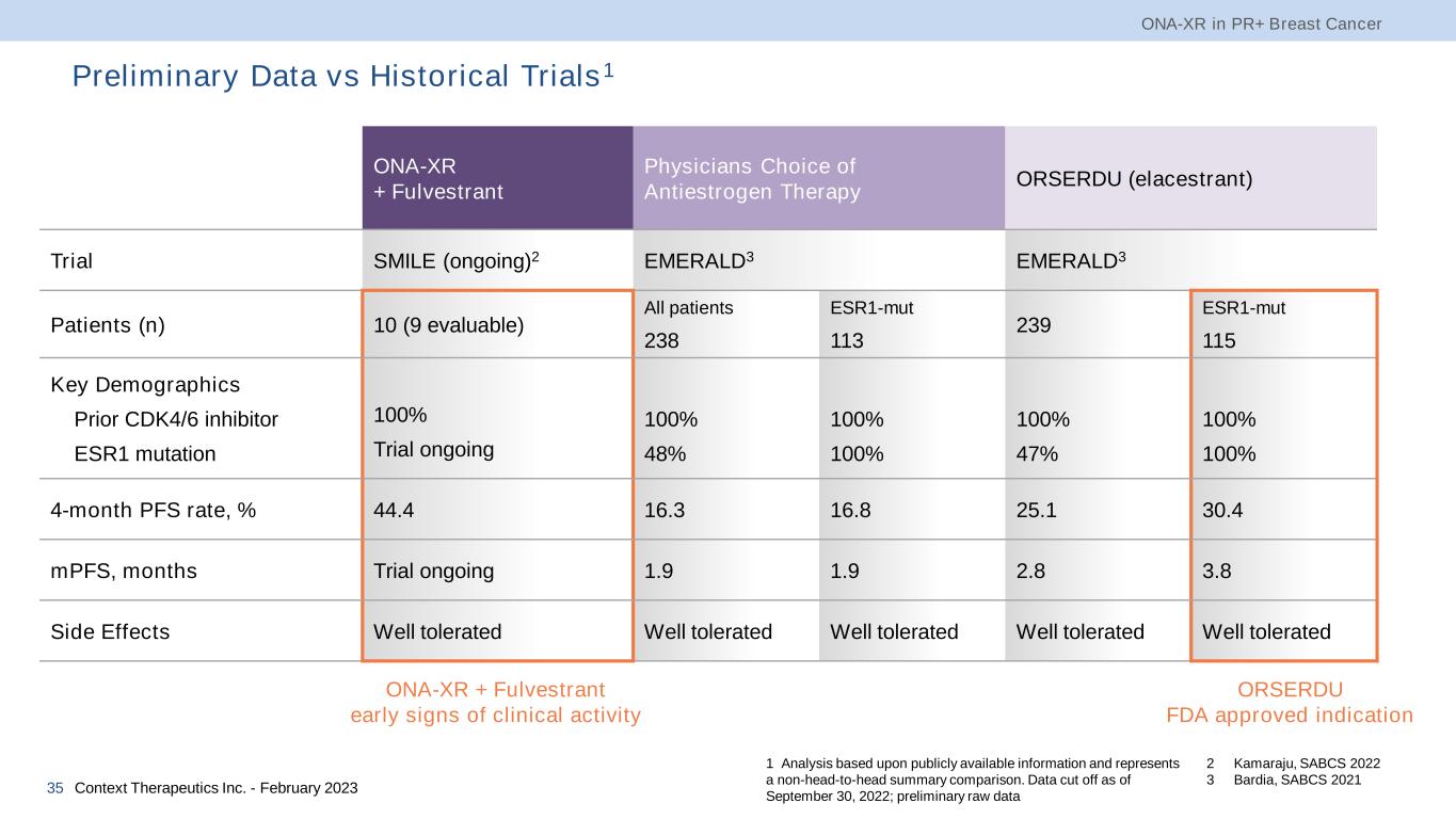 Our Development Strategy in 2L/3L HR+,HER2- Metastatic Breast Cancer ONA-XR in PR+ Breast Cancer Context Therapeutics Inc. - February 202334 • Estimated 115,000 treatment eligible patients in United States and EU5 • Unmet need for new therapies that can improve antiestrogen response after CDK4/6 inhibitor therapy without adding significant toxicity • New cytotoxic treatments, including antibody drug-conjugate (Enhertu) therapy, expected to be used once patients are no longer responsive to antihormonal therapy, including ORSERDU (elacestrant) Ongoing Context Clinical Trials in Post-CDK4/6 Treatment Line Phase 2 SMILE Trial Phase 1b/2 ELONA Trial Patients (n) 39 67 Indication 2L/3L ER+,HER2- mBC 2L/3L ER+,PR+, HER2- mBC Treatment ONA-XR + fulvestrant ONA-XR + ORSERDU (elacestrant) Enrich for ESR1 Mutated No Yes Prior Chemotherapy in Metastatic Setting Yes No Prior CDK4/6 Inhibitor in Metastatic Setting Required Required Next Expected Data Milestone Q4 2023 Q4 2023