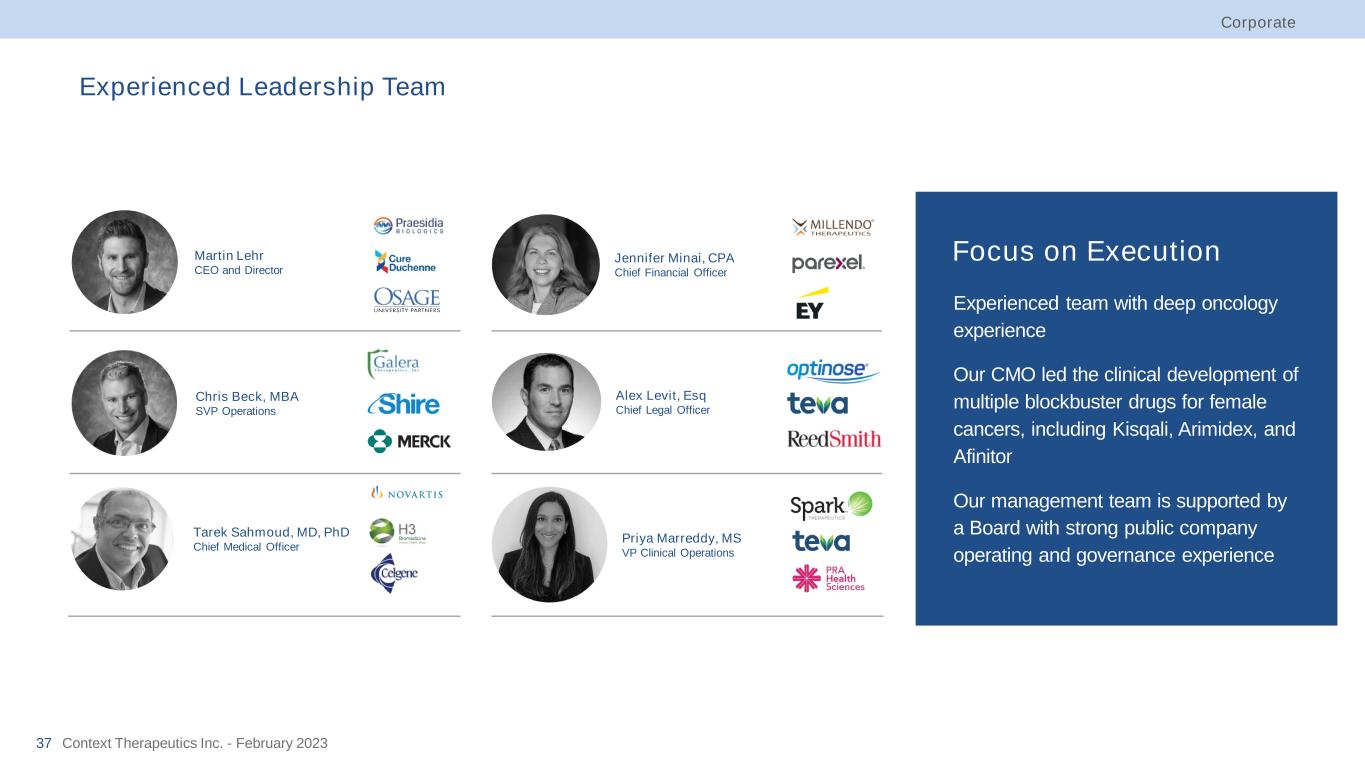 Corporate Experienced Leadership Team • Experienced team with deep oncology experience • Our CMO led the clinical development of multiple blockbuster drugs for female cancers, including Kisqali, Arimidex, and Afinitor • Our management team is supported by a Board with strong public company operating and governance experience Focus on Execution Martin Lehr CEO and Director Tarek Sahmoud, MD, PhD Chief Medical Officer Alex Levit, Esq Chief Legal Officer Jennifer Minai, CPA Chief Financial Officer Chris Beck, MBA SVP Operations Priya Marreddy, MS VP Clinical Operations Context Therapeutics Inc. - February 202337