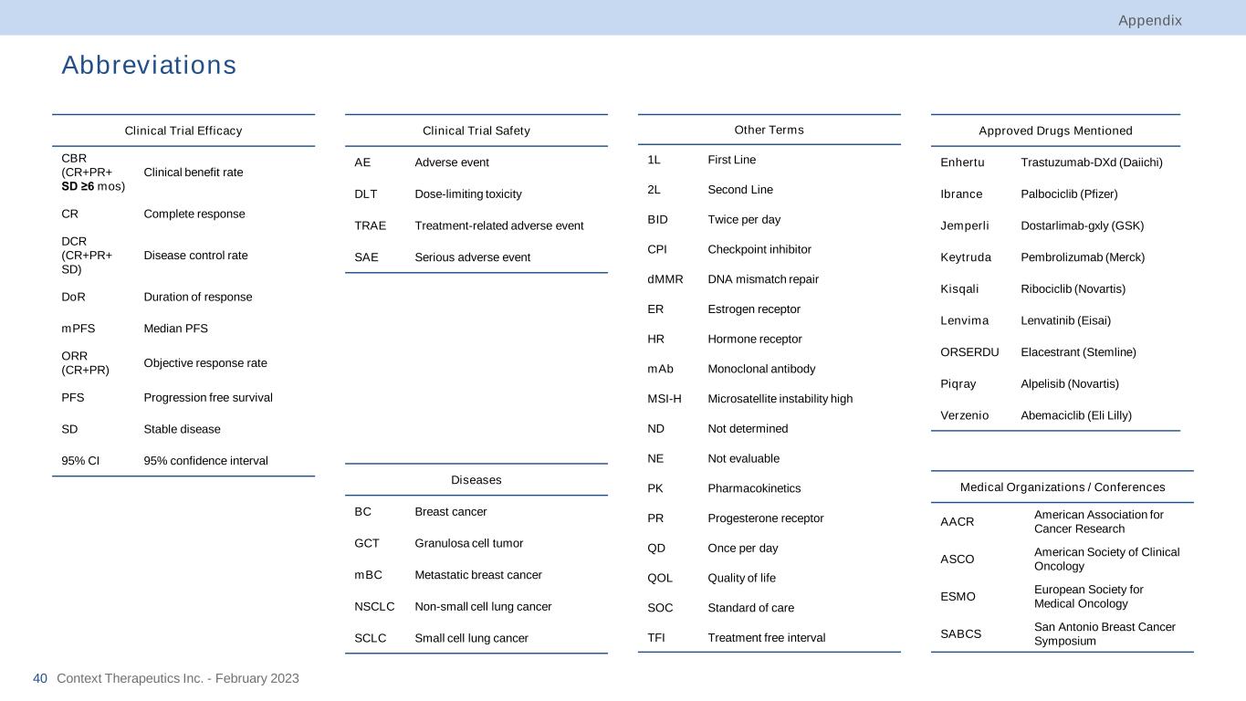 Appendix Abbreviations Context Therapeutics Inc. - February 202340 Clinical Trial Efficacy CBR (CR+PR+ SD ≥6 mos) Clinical benefit rate CR Complete response DCR (CR+PR+ SD) Disease control rate DoR Duration of response mPFS Median PFS ORR (CR+PR) Objective response rate PFS Progression free survival SD Stable disease 95% CI 95% confidence interval Clinical Trial Safety AE Adverse event DLT Dose-limiting toxicity TRAE Treatment-related adverse event SAE Serious adverse event Other Terms 1L First Line 2L Second Line BID Twice per day CPI Checkpoint inhibitor dMMR DNA mismatch repair ER Estrogen receptor HR Hormone receptor mAb Monoclonal antibody MSI-H Microsatellite instability high ND Not determined NE Not evaluable PK Pharmacokinetics PR Progesterone receptor QD Once per day QOL Quality of life SOC Standard of care TFI Treatment free interval Approved Drugs Mentioned Enhertu Trastuzumab-DXd (Daiichi) Ibrance Palbociclib (Pfizer) Jemperli Dostarlimab-gxly (GSK) Keytruda Pembrolizumab (Merck) Kisqali Ribociclib (Novartis) Lenvima Lenvatinib (Eisai) ORSERDU Elacestrant (Stemline) Piqray Alpelisib (Novartis) Verzenio Abemaciclib (Eli Lilly) Medical Organizations / Conferences AACR American Association for Cancer Research ASCO American Society of Clinical Oncology ESMO European Society for Medical Oncology SABCS San Antonio Breast Cancer Symposium Diseases BC Breast cancer GCT Granulosa cell tumor mBC Metastatic breast cancer NSCLC Non-small cell lung cancer SCLC Small cell lung cancer