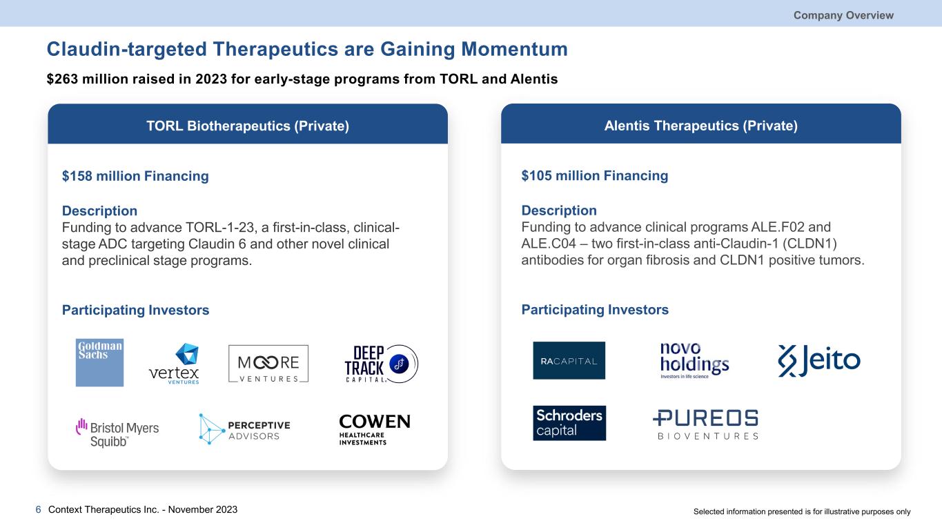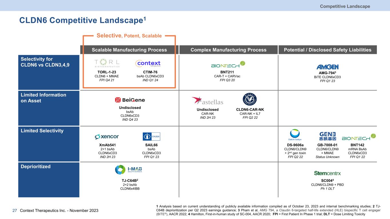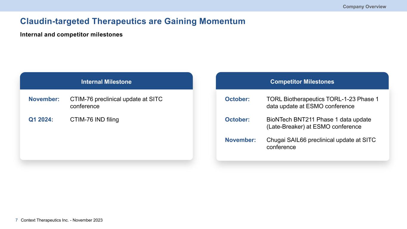 Claudin-targeted Therapeutics are Gaining Momentum Internal and competitor milestones Company Overview Internal Milestone Competitor Milestones 7 November: CTIM-76 preclinical update at SITC conference Q1 2024: CTIM-76 IND filing October: TORL Biotherapeutics TORL-1-23 Phase 1 data update at ESMO conference October: BioNTech BNT211 Phase 1 data update (Late-Breaker) at ESMO conference November: Chugai SAIL66 preclinical update at SITC conference Context Therapeutics Inc. - November 2023