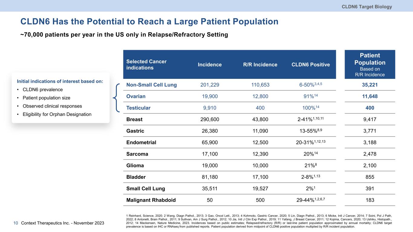 CLDN6 Has the Potential to Reach a Large Patient Population ~70,000 patients per year in the US only in Relapse/Refractory Setting CLDN6 Target Biology 10 Selected Cancer indications Incidence R/R Incidence CLDN6 Positive Patient Population Based on R/R Incidence Non-Small Cell Lung 201,229 110,653 6-50%3,4,5 35,221 Ovarian 19,900 12,800 91%14 11,648 Testicular 9,910 400 100%14 400 Breast 290,600 43,800 2-41%1,10,11 9,417 Gastric 26,380 11,090 13-55%8,9 3,771 Endometrial 65,900 12,500 20-31%1,12,13 3,188 Sarcoma 17,100 12,390 20%14 2,478 Glioma 19,000 10,000 21%8 2,100 Bladder 81,180 17,100 2-8%1,13 855 Small Cell Lung 35,511 19,527 2%1 391 Malignant Rhabdoid 50 500 29-44%1,2,6,7 183 1 Reinhard, Science, 2020; 2 Wang, Diagn Pathol., 2013; 3 Gao, Oncol Lett., 2013; 4 Kohmoto, Gastric Cancer, 2020; 5 Lin, Diagn Pathol., 2013; 6 Micke, Intl J Cancer, 2014; 7 Soini, Pol J Path, 2022; 8 Antonelli, Brain Pathol., 2011; 9 Sullivan, Am J Surg Pathol., 2012; 10 Jia, Intl J Clin Exp Pathol., 2019; 11 Yafang, J Breast Cancer, 2011; 12 Kojima, Cancers, 2020; 13 Ushiku, Histopath., 2012; 14 Mackensen, Nature Medicine, 2023. Incidences based on public estimates; Relapsed/refractory (R/R) or last-line patient population approximated by annual mortality; CLDN6 target prevalence is based on IHC or RNAseq from published reports. Patient population derived from midpoint of CLDN6 positive population multiplied by R/R incident population. Initial indications of interest based on: • CLDN6 prevalence • Patient population size • Observed clinical responses • Eligibility for Orphan Designation Context Therapeutics Inc. - November 2023