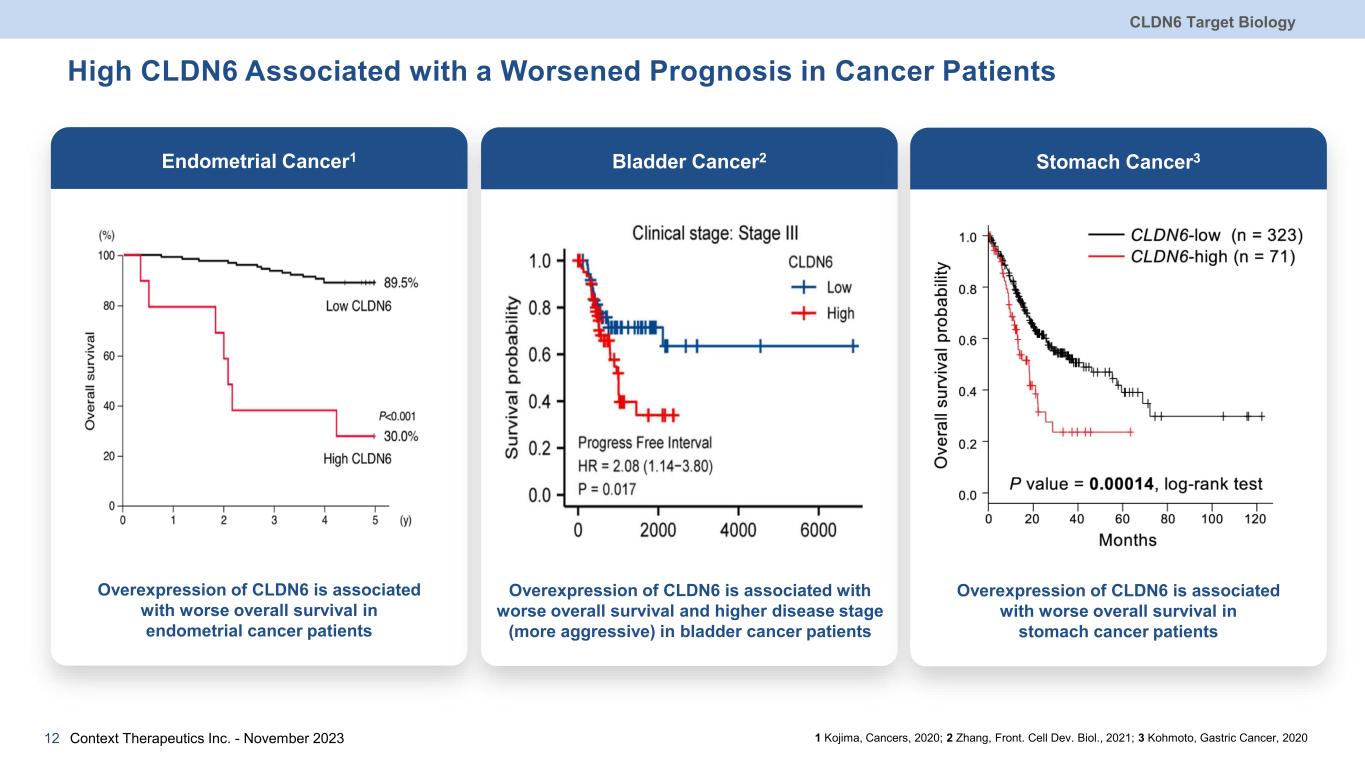 High CLDN6 Associated with a Worsened Prognosis in Cancer Patients CLDN6 Target Biology Context Therapeutics Inc. - November 202312 Endometrial Cancer1 Overexpression of CLDN6 is associated with worse overall survival in endometrial cancer patients 1 Kojima, Cancers, 2020; 2 Zhang, Front. Cell Dev. Biol., 2021; 3 Kohmoto, Gastric Cancer, 2020 Bladder Cancer2 Overexpression of CLDN6 is associated with worse overall survival and higher disease stage (more aggressive) in bladder cancer patients Stomach Cancer3 Overexpression of CLDN6 is associated with worse overall survival in stomach cancer patients