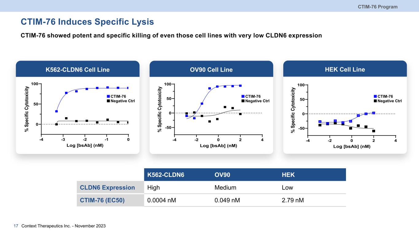 CTIM-76 Exhibits Excellent Selectivity and Potency CTIM-76 Program Context Therapeutics Inc. - November 202316 • CTIM-76 CLDN6 EC50 of 3.41 nM (binding) • CTIM-76 preferentially binds to CLDN6 over CLDN3/4/9 • CLDN3/4/6/9 were transiently transfected in HEK-293F cells (4:1 Target:GFP) CLDN6 Selectivity -11 -10 -9 -8 -7 -6 -5 0 50,000 100,000 150,000 200,000 Log [Bispecific] (M) Ce ll Bi nd in g (M FI ) Human CLDN6 Human CLDN4 Human CLDN3 Human CLDN9 Negative CLDN6 Potency • Potency assay provides a better assessment than binding assays for off-target liabilities associated with CLDN3, CLDN4, or CLDN9 • CTIM-76 CLDN6 EC50 of 0.0004 nM (cytotoxicity) • CTIM-76 preferentially targets CLDN6, with minimal binding and cytotoxicity against CLDN9-expressing cells >10,000x >500x